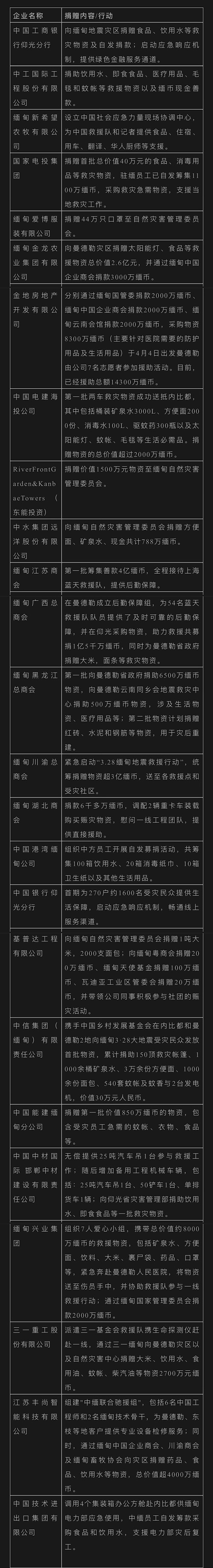 名為“CECCM”標(biāo)稱“緬甸中國企業(yè)商會”的微信公眾號多日來記錄中國企業(yè)在緬援助行動:國家電投、金地地產(chǎn)、緬甸江蘇商會等籌集現(xiàn)金,用于采購物資與調(diào)配設(shè)備;工商銀行仰光分行、中工國際、中國電建海投等企業(yè)捐贈食品、醫(yī)療用品等物資,保障受災(zāi)群眾生活和醫(yī)療需求。