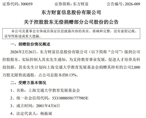 2月27日,東方財(cái)富信息股份有限公司(簡(jiǎn)稱“東方財(cái)富”)發(fā)布關(guān)于控股股東無(wú)償捐贈(zèng)部分公司股份的公告。公告稱,2月26日,東方財(cái)富信息股份有限公司接到公司控股股東、實(shí)際控制人其實(shí)通知,為支持教育事業(yè)發(fā)展,促進(jìn)人才培養(yǎng)及科技創(chuàng)新,其實(shí)計(jì)劃向上海交通大學(xué)教育發(fā)展基金會(huì)捐贈(zèng)其持有的公司2000萬(wàn)股無(wú)限售流通股,占公司總股本的0.13%。