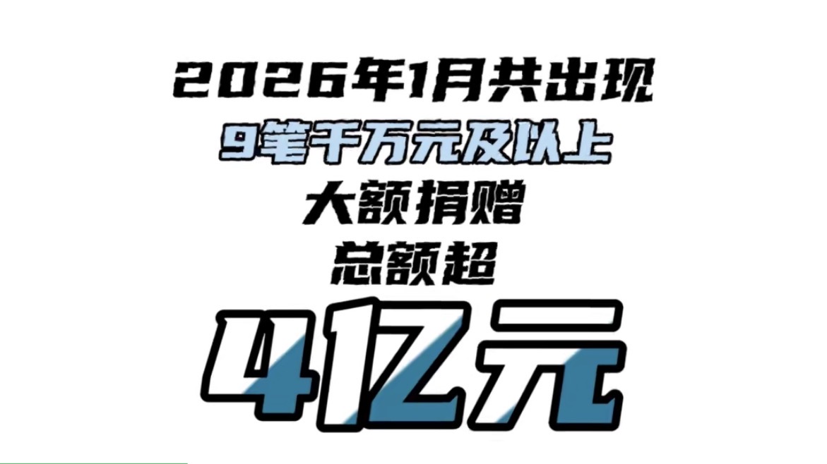 2026年1月大額捐贈(zèng)一覽:千萬元及以上捐贈(zèng)超4億元,捐贈(zèng)總額大幅下降