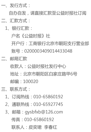 注:為能準(zhǔn)確及時(shí)收到報(bào)紙,請(qǐng)認(rèn)真填寫閱讀回執(zhí)后傳真或郵寄至公益時(shí)報(bào)社。 點(diǎn)擊此處下載報(bào)銷憑證和回執(zhí) |