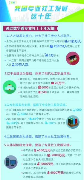 顧朝曦全面總結(jié)了十年社會(huì)工作發(fā)展成就。他指出,十年來(lái),我國(guó)初步建立了綜合政策引領(lǐng)、專(zhuān)項(xiàng)政策配套、地方政策支撐的社會(huì)工作制度框架;社會(huì)工作專(zhuān)業(yè)人才隊(duì)伍迅速壯大,規(guī)??偭窟_(dá)到76萬(wàn)人,其中持證社工近30萬(wàn)人;相關(guān)事業(yè)單位、群團(tuán)組織、社區(qū)和社會(huì)組織社會(huì)工作專(zhuān)業(yè)崗位超過(guò)20萬(wàn)個(gè),社會(huì)工作服務(wù)機(jī)構(gòu)達(dá)到6600余家。社會(huì)工作從民政領(lǐng)域逐步拓展到多個(gè)領(lǐng)域,從東部發(fā)達(dá)地區(qū)延伸到中西部邊遠(yuǎn)貧困地區(qū),在助力保障改善民生、創(chuàng)新社會(huì)治理、促進(jìn)社會(huì)和諧、夯實(shí)黨的執(zhí)政基礎(chǔ)中發(fā)揮了重要作用。