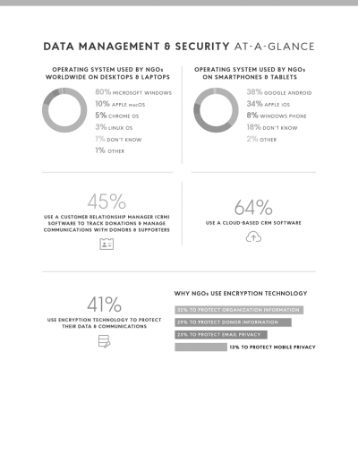 在數(shù)據(jù)安全上,只有41%的全球受訪者使用加密技術(shù)來保護(hù)數(shù)據(jù)和通信。Nonprofit Tech for Good創(chuàng)始人Heather Mansfield表示:“全球非政府組織正在快速擴(kuò)大技術(shù)應(yīng)用,隨著對(duì)技術(shù)依賴性的增加,他們的數(shù)據(jù)管理和安全需求也隨之增長(zhǎng),2018年報(bào)告的調(diào)查結(jié)果證實(shí)了這點(diǎn)。今年的報(bào)告首次為組織和捐贈(zèng)數(shù)據(jù)的管理和保護(hù)提供了基準(zhǔn)。非政府組織在這方面落后于私營(yíng)機(jī)構(gòu),通過提供基準(zhǔn),我們希望鼓勵(lì)非政府組織升級(jí)他們的數(shù)據(jù)管理和安全業(yè)務(wù)。”