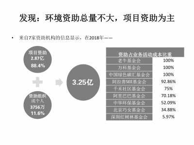 《報告》顯示,2018年CEGA中的7家基金會為中國的環(huán)保公益領(lǐng)域提供了總計約為3.25億元的資助,項目資助占總體資助的88.4%,資助組織和個人的約占11.6%,這表明國內(nèi)目前環(huán)境資助總量不大,資助者仍以項目資助為主。
