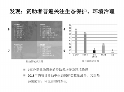 生態(tài)保護、環(huán)境治理領(lǐng)域關(guān)注多。從環(huán)保公益資金投入的具體領(lǐng)域來看,生態(tài)保護最多,占43%;其次是污染防治占37%;環(huán)境治理占16%;應(yīng)對氣候變化的項目較少,占4%。報告顯示,2018年的項目資助中,9家分享資助清單的資助者均涉及環(huán)境治理。