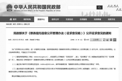 為了進(jìn)一步解決慈善信托信息公開內(nèi)容不夠具體、程序不夠規(guī)范等問題,民政部起草了《慈善信托信息公開管理辦法(征求意見稿)》。