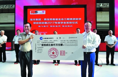 寶豐燕寶慈善基金會(huì)在實(shí)施一、二期捐資助學(xué)項(xiàng)目的基礎(chǔ)上,2017年啟動(dòng)三期捐資助學(xué)項(xiàng)目,新增捐資獎(jiǎng)學(xué)金12.3億元,新增資助10.56萬名貧困地區(qū)學(xué)生完成學(xué)業(yè)。今年為9.2萬名受助學(xué)生發(fā)放2017年度獎(jiǎng)學(xué)金2.8億元,新增受助學(xué)生2.64萬人。自此,寶豐燕寶慈善基金會(huì)每年資助學(xué)生保持10萬人左右,每年畢業(yè)約3萬人,每年新增資助約3萬人,每年發(fā)放獎(jiǎng)學(xué)金近3億元,每年為10萬余個(gè)家庭減輕經(jīng)濟(jì)負(fù)擔(dān)、幫助3萬余個(gè)家庭實(shí)現(xiàn)新的經(jīng)濟(jì)增長點(diǎn)。如此大規(guī)模的捐助、如此廣的受益人群,開創(chuàng)了全國教育扶貧歷史之最,為國家和自治區(qū)扶貧攻堅(jiān)事業(yè)做出了積極貢獻(xiàn)。