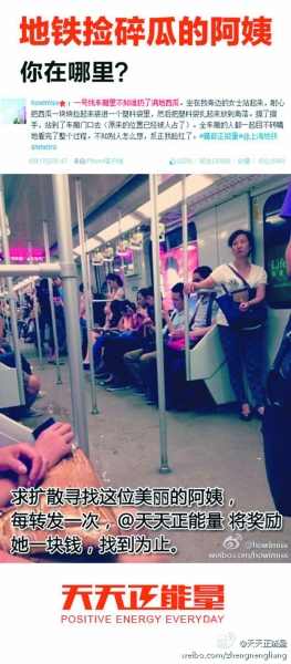 2013年6月,上海地鐵一號線擁擠的車廂里,不知誰扔了一地西瓜皮,人來人往卻都視若無睹。一位女阿姨從座位上站起來,耐心把西瓜皮一塊塊撿起裝進塑料袋,扎起來放到角落,然后擦了擦手,站到車廂門口(她的座位已經被人占了)。