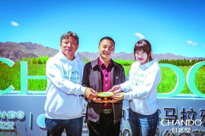 張波副縣長(中)為自然堂公益一行贈送草籽2019年7月,伽藍(lán)集團(tuán)公關(guān)傳播總經(jīng)理陳涓玲再次踏足西藏這片神圣的土地。