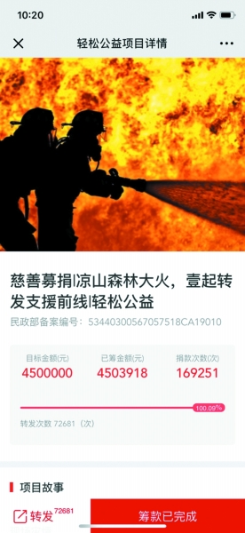 2019年3月30日,四川涼山發(fā)生重大森林火災(zāi),涼山消防隊(duì)員689人在海拔4000余米的原始森林展開撲救行動(dòng)。但撲救行動(dòng)中受到風(fēng)力風(fēng)向的突變影響,大火突發(fā)爆燃,消防員突遇險(xiǎn)情后部分人員失聯(lián)。緊急時(shí)刻,輕松公益上線壹基金“涼山森林大火,壹起轉(zhuǎn)發(fā)支援前線”公益項(xiàng)目,僅18小時(shí)就獲得17萬網(wǎng)友的支持,火速籌滿善款450萬元并第一時(shí)間送往前線。