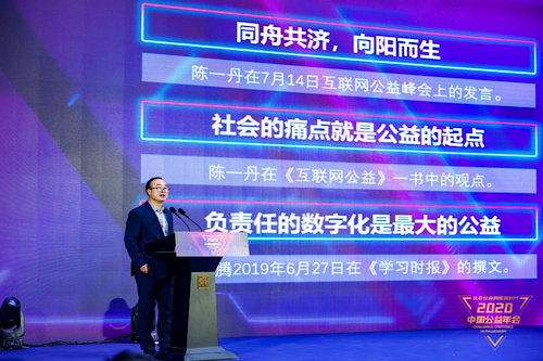 2020年12月23日,2020中國公益年會在京舉行。年會以“社會公益的綻放時代”為主題,由《公益時報》社主辦,騰訊公益慈善基金會、河仁慈善基金會、新奧公益慈善基金會聯(lián)合主辦,北京大學(xué)國家發(fā)展研究院、長江商學(xué)院、深圳國際公益學(xué)院提供學(xué)術(shù)支持,企業(yè)公民(東升匯)俱樂部支持。