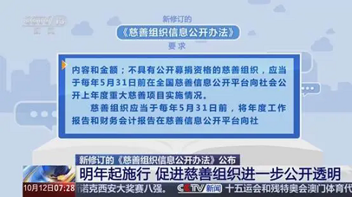 《辦法》還對公開的時間節(jié)點作出了詳細規(guī)定:年報、財報須在每年5月31日前公開;突發(fā)事件募捐階段,每5天更新一次善款信息;項目終止后,三個月內(nèi)披露剩余財產(chǎn)處理;慈善信托須每年至少公開一次……