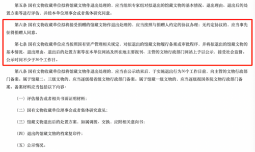 第七條規(guī)定,國有文物收藏單位對擬退出的館藏文物履行備案或?qū)徟绦?,?yīng)將館藏文物的基本情況、退出理由、退出后的處置方案等進(jìn)行不少于30個(gè)工作日的公示期,接受社會(huì)監(jiān)督。