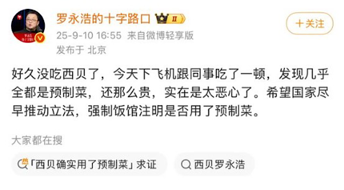 9月10日,羅永浩在微博公開吐槽連鎖餐飲品牌西貝:“幾乎全是預(yù)制菜,還那么貴”。次日,西貝創(chuàng)始人賈國龍用三個“一定”回應(yīng):“我們一定會起訴他,一定一定會起訴他!”相關(guān)話題隨即沖上熱搜。