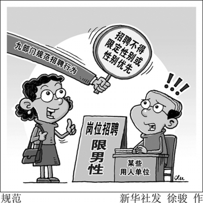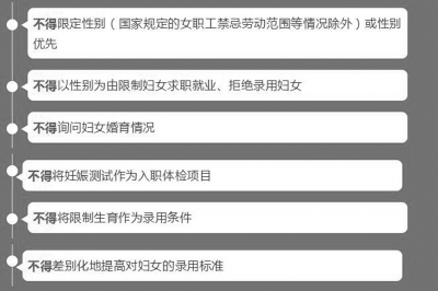 近日,人力資源和社會(huì)保障部、教育部等,其中規(guī)定,在招聘行為中,不得限定性別(國家規(guī)定的女職工禁忌勞動(dòng)范圍等情況除外)或性別優(yōu)先,不得以性別為由限制婦女求職就業(yè)、拒絕錄用婦女,不得將限制生育作為錄用條件。
