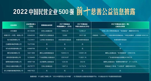 《公益時(shí)報(bào)》記者通過(guò)檢索10家企業(yè)官網(wǎng)及中國(guó)社會(huì)組織政務(wù)服務(wù)平臺(tái)發(fā)現(xiàn),“2022中國(guó)民營(yíng)企業(yè)500強(qiáng)”前十名有七家設(shè)有企業(yè)基金會(huì),三家入選首批互聯(lián)網(wǎng)公開募捐信息平臺(tái)。具體包括,京東集團(tuán)設(shè)立的京東公益基金會(huì)、阿里巴巴集團(tuán)設(shè)立的阿里巴巴公益基金會(huì)、恒力集團(tuán)設(shè)立的江蘇恒力慈善基金會(huì)、騰訊集團(tuán)設(shè)立的騰訊公益慈善基金會(huì)、碧桂園設(shè)立的廣東省國(guó)強(qiáng)公益基金會(huì)、聯(lián)想控股設(shè)立的北京聯(lián)想公益基金會(huì)以及萬(wàn)科設(shè)立的萬(wàn)科公益基金會(huì)。