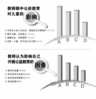 學(xué)校教育是影響青少年成長(zhǎng)的主導(dǎo)力量,學(xué)校是公益教育開展的重要場(chǎng)所和主體。學(xué)校教育中最為關(guān)鍵的要素是教師,教師對(duì)公益教育的認(rèn)識(shí)、認(rèn)同及開展公益教育的素養(yǎng)是決定學(xué)校公益教育開展情況的至關(guān)重要的因素。因此,在公益教育開展中,需要了解教師的有關(guān)情況,以準(zhǔn)確把握在中小學(xué)開展什么樣的公益教育,并有效地引導(dǎo)教師參與到公益教育中。 北京市海淀區(qū)位于北京城區(qū)西北部,其轄區(qū)內(nèi)約一半?yún)^(qū)域的學(xué)校為通常意義上的市區(qū)學(xué)校,另一半?yún)^(qū)域的學(xué)校為郊區(qū)或農(nóng)村學(xué)校;既有在北京市辦學(xué)層次處于一類的學(xué)校,也有辦學(xué)層次較低的學(xué)校。因此,在該區(qū)域選擇若干學(xué)校進(jìn)行調(diào)查具有較大的代表性。北京師范大學(xué)社會(huì)發(fā)展與公共政策研究院的公益教育研究所對(duì)該區(qū)21所學(xué)校的1000名教師進(jìn)行了公益教育方面的調(diào)研。調(diào)查發(fā)現(xiàn),目前小學(xué)教師對(duì)公益教育的了解和開展的公益教育有限。 公益認(rèn)知缺乏深度 大部分小學(xué)教師對(duì)公益有一定認(rèn)識(shí),但是不夠全面和深入。對(duì)“公益”的認(rèn)識(shí)主要局限在常識(shí)意義的理解上,偏重于“指向于他人的”,而缺乏指向于“集體”或“社會(huì)”的理解。 在“您認(rèn)為公益是 ”的多項(xiàng)選擇調(diào)查中,被選擇最多的選項(xiàng)是“為他人服務(wù)”,占教師總數(shù)的83.8%;次多的選項(xiàng)是“志愿精神”,72.9%的人選擇了這一項(xiàng),說明了大部分認(rèn)為“公益”是一種自愿的行為,甚至有36.2%的人認(rèn)為公益是“犧牲自我、不求回報(bào)”的行為。有53.9%的教師認(rèn)為“公益”是“公共利益”。比較而言,認(rèn)為“公益”是“指向于他人的”人數(shù)比認(rèn)為是“公共利益”的人數(shù)多29.9%,接近三分之一。 對(duì)“公益教育”這一概念,有16.6%的人沒有聽說過,有69.8的人“了解一點(diǎn)”,兩項(xiàng)合計(jì)為“86.4%”;“比較了解”和“非常了解”的共占13.6%,說明大部分教師雖然對(duì)“公益”一詞不陌生,但是對(duì)“公益教育”的了解較少。就目前的理解來(lái)說,認(rèn)為其與“品格、道德教育”最相似的教師比例最高,達(dá)到64.5%,有62.8%的人認(rèn)為其是“培養(yǎng)志愿精神”,一半左右的教師認(rèn)為其與“人文教育”、“公民教育”、“素質(zhì)教育”相似。 公益教育的實(shí)施有哪些作用?在公益對(duì)兒童的影響方面,教師更為看重“指向于他人”的方面,91.3%的教師認(rèn)為是讓學(xué)生“學(xué)會(huì)關(guān)心他人與社會(huì)”、“增強(qiáng)社會(huì)公德意識(shí)”,而選擇公益教育的影響是促進(jìn)孩子自身發(fā)展的“提升溝通、交往能力”和“接觸社會(huì)、開闊視野”的比例分別是75.6%和79.5%,認(rèn)為公益教育能夠“培養(yǎng)(兒童)學(xué)習(xí)及行為習(xí)慣”的教師僅有44.1%。 公益教育偏重人文類課程 大多數(shù)小學(xué)教師認(rèn)為公益教育的實(shí)施途徑主要為德育方面的課程與活動(dòng),是否能融入到其他學(xué)科教學(xué)之中,與這門課是否有活動(dòng)形式的教學(xué)有關(guān)系。 與上述關(guān)于公益及公益教育的認(rèn)識(shí)相關(guān)的是,“在哪些課程或活動(dòng)中體現(xiàn)公益教育”的調(diào)查中,有超過50%的教師認(rèn)為不能在品德課程、班會(huì)活動(dòng)或德育活動(dòng)之外的課程中進(jìn)行。 除了品德課程之外,認(rèn)為在語(yǔ)文學(xué)科中可以融入公益教育的教師最多,可能與語(yǔ)文的人文性是有關(guān)系的。在小學(xué)教育中,語(yǔ)文教育既擔(dān)負(fù)著工具性的教學(xué)讀寫等之外,還肩負(fù)著對(duì)學(xué)生進(jìn)行“人文”教育的任務(wù)。英語(yǔ)、數(shù)學(xué)、體育和科學(xué)被選擇得很少,這與教師關(guān)于這些學(xué)科的學(xué)科觀有關(guān)系。 深入分析,教師認(rèn)為一門課能否融入公益教育,與這門課是否有活動(dòng)形式的教學(xué)有關(guān)系,結(jié)合項(xiàng)目組的訪談內(nèi)容可發(fā)現(xiàn),大多數(shù)老師都認(rèn)同公益教育需要通過一系列有計(jì)劃的活動(dòng),才能將公益理念落實(shí)。 選擇“藝術(shù)”和“健康教育”的人數(shù)比語(yǔ)文之外的其他學(xué)科多,可能是因?yàn)樗囆g(shù)、健康教育中的活動(dòng)居多;選擇“科學(xué)”的明顯比選擇英語(yǔ)、數(shù)學(xué)、體育的教師多,也可能是因?yàn)檫@一學(xué)科中的活動(dòng)比其他學(xué)科多。 時(shí)間、精力、安全問題突出 調(diào)查中發(fā)現(xiàn),目前中小學(xué)教師開展公益教育的情況較少,并且不同學(xué)校存在著較大差異。那么,教師開展公益教育與哪些因素相關(guān)呢?時(shí)間、精力、安全問題是影響小學(xué)教師選擇開展公益教育的重要因素。這可能與他們關(guān)于公益教育主要以“活動(dòng)”形式開展的認(rèn)識(shí)是有關(guān)的,因?yàn)檎J(rèn)為是“活動(dòng)”,因而就認(rèn)為需要在正常課堂教學(xué)活動(dòng)之外安排單獨(dú)時(shí)間開展,這勢(shì)必“擠壓”當(dāng)前師生