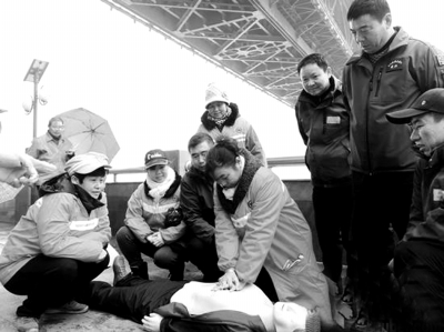 12月20日,在武漢長(zhǎng)江大橋清潔隊(duì)的“救人姐”涂曉珍的邀請(qǐng)下,長(zhǎng)江救援隊(duì)隊(duì)員來到了長(zhǎng)江大橋橋堡下,與30余名環(huán)衛(wèi)工人們進(jìn)行了會(huì)面。兩支隊(duì)伍達(dá)成一致:今后互留電話,及時(shí)溝通,橋上橋下共同救援。長(zhǎng)江隊(duì)隊(duì)員趙漢清以現(xiàn)場(chǎng)模擬救人的方式,給幾名環(huán)衛(wèi)工培訓(xùn)了心肺復(fù)蘇。