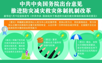 《中共中央 國(guó)務(wù)院關(guān)于推進(jìn)防災(zāi)減災(zāi)救災(zāi)體制機(jī)制改革的意見》1月10日公布。民政部相關(guān)負(fù)責(zé)人表示,《意見》著眼當(dāng)前我國(guó)防災(zāi)減災(zāi)救災(zāi)工作面臨的問題和體制機(jī)制方面的制約因素,通過頂層設(shè)計(jì),針對(duì)三大體制機(jī)制完善升級(jí)提出了一系列改革舉措,有助于不斷提升我國(guó)防災(zāi)減災(zāi)救災(zāi)能力。 我國(guó)是世界上自然災(zāi)害最為嚴(yán)重的國(guó)家之一,災(zāi)害種類多,分布地域廣,發(fā)生頻率高,造成損失重。近年來(lái),基于對(duì)自然災(zāi)害形勢(shì)的研判,我國(guó)不斷探索,確立了以防為主、防抗救相結(jié)合的工作方針,積累了寶貴經(jīng)驗(yàn),綜合防災(zāi)減災(zāi)救災(zāi)能力明顯提升。 然而,我國(guó)面臨的自然災(zāi)害形勢(shì)依然復(fù)雜嚴(yán)峻,實(shí)際工作中也發(fā)現(xiàn),防災(zāi)減災(zāi)救災(zāi)工作出現(xiàn)了管理體制不順、相關(guān)法律法規(guī)分散零碎、部門之間工作脫節(jié)、一些地方重救災(zāi)輕減災(zāi)等問題。 民政部相關(guān)負(fù)責(zé)人表示,對(duì)于加強(qiáng)防災(zāi)減災(zāi)救災(zāi)工作,習(xí)近平總書記在中央政治局集體學(xué)習(xí)和到河北唐山考察時(shí)分別作出過重要指示,要求進(jìn)一步增強(qiáng)憂患意識(shí)、責(zé)任意識(shí),全面提升全社會(huì)抵御自然災(zāi)害的綜合防范能力。中央深改組第28次會(huì)議審議通過相關(guān)文件,明確了推進(jìn)防災(zāi)減災(zāi)救災(zāi)體制機(jī)制改革的方向。 此次出臺(tái)的《意見》,對(duì)推進(jìn)防災(zāi)減災(zāi)救災(zāi)體制機(jī)制改革明確了五項(xiàng)基本原則:堅(jiān)持以人為本,切實(shí)保障人民群眾生命財(cái)產(chǎn)安全;堅(jiān)持以防為主、防抗救相結(jié)合;堅(jiān)持綜合減災(zāi),統(tǒng)籌抵御各種自然災(zāi)害;堅(jiān)持分級(jí)負(fù)責(zé)、屬地管理為主;堅(jiān)持黨委領(lǐng)導(dǎo)、政府主導(dǎo)、社會(huì)力量和市場(chǎng)機(jī)制廣泛參與。 根據(jù)《意見》,我國(guó)將著力從三方面推進(jìn)防災(zāi)減災(zāi)救災(zāi)體制機(jī)制改革: ——健全統(tǒng)籌協(xié)調(diào)體制??傮w要求是統(tǒng)籌災(zāi)害管理和綜合減災(zāi)。其中,尤其是要加強(qiáng)各種自然災(zāi)害管理全過程的綜合協(xié)調(diào),強(qiáng)化資源統(tǒng)籌和工作協(xié)調(diào)。充分發(fā)揮國(guó)家減災(zāi)委員會(huì)等有關(guān)部門和軍隊(duì)、武警部隊(duì)的職能作用。同時(shí),要牢固樹立災(zāi)害風(fēng)險(xiǎn)管理理念,轉(zhuǎn)變重救災(zāi)輕減災(zāi)思想,將防災(zāi)減災(zāi)納入國(guó)民教育計(jì)劃。 ——健全屬地管理體制?!兑庖姟窂?qiáng)調(diào),要強(qiáng)化地方應(yīng)急救災(zāi)主體責(zé)任、健全災(zāi)后恢復(fù)重建工作制度、完善軍地協(xié)調(diào)聯(lián)動(dòng)制度。對(duì)達(dá)到國(guó)家啟動(dòng)響應(yīng)等級(jí)的自然災(zāi)害,中央發(fā)揮統(tǒng)籌指導(dǎo)和支持作用,地方黨委和政府在災(zāi)害應(yīng)對(duì)中發(fā)揮主體作用,承擔(dān)主體責(zé)任。同時(shí),要健全軍隊(duì)和武警部隊(duì)參與搶險(xiǎn)救災(zāi)的應(yīng)急協(xié)調(diào)機(jī)制,提升軍地應(yīng)急救援協(xié)助水平。 ——完善社會(huì)力量和市場(chǎng)參與機(jī)制。一方面,要研究制定和完善社會(huì)力量參與防災(zāi)減災(zāi)救災(zāi)的相關(guān)制度,完善政府與社會(huì)力量協(xié)同救災(zāi)聯(lián)動(dòng)機(jī)制,落實(shí)支持措施。另一方面,要鼓勵(lì)支持社會(huì)力量全方位參與,構(gòu)建多方參與的社會(huì)化防災(zāi)減災(zāi)救災(zāi)格局,如加快巨災(zāi)保險(xiǎn)制度建設(shè)、積極推進(jìn)農(nóng)業(yè)保險(xiǎn)和農(nóng)村住房保險(xiǎn)工作等。 民政部相關(guān)負(fù)責(zé)人表示,要推動(dòng)各項(xiàng)改革措施落到實(shí)處,需要通過加大宣傳調(diào)動(dòng)各方面積極性,通過及時(shí)修訂完善相關(guān)法律法規(guī)和預(yù)案強(qiáng)化法治保障,通過健全資金多元投入機(jī)制加大資金支持力度。 與此同時(shí),落實(shí)還需要有明確的計(jì)劃以及相應(yīng)的督促舉措。 該負(fù)責(zé)人表示,《意見》明確了分工方案,規(guī)定了牽頭部門和完成時(shí)間,需要負(fù)責(zé)部門及時(shí)制定方案推進(jìn)落實(shí)。各地區(qū)要發(fā)揮主動(dòng)性和創(chuàng)造性,積極探索,破解難題,積累經(jīng)驗(yàn)。要建立督促檢查機(jī)制,根據(jù)明確的責(zé)任和要求,督促工作落實(shí)。對(duì)做得好的地區(qū)或單位要表?yè)P(yáng)鼓勵(lì),對(duì)工作落后的地區(qū)或單位要幫助查找原因,推動(dòng)整改工作。 (據(jù)新華社) |