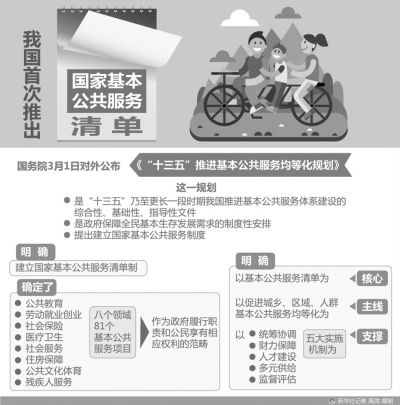 3月1日,國(guó)務(wù)院印發(fā)的《“十三五”推進(jìn)基本公共服務(wù)均等化規(guī)劃》正式對(duì)外公布。《規(guī)劃》提出,到2020年,基本公共服務(wù)體系更加完善,體制機(jī)制更加健全,在學(xué)有所教、勞有所得、病有所醫(yī)、老有所養(yǎng)、住有所居等方面持續(xù)取得新進(jìn)展,基本公共服務(wù)均等化總體實(shí)現(xiàn)。 什么是基本公共服務(wù)? 據(jù)國(guó)家發(fā)展改革委有關(guān)負(fù)責(zé)人介紹,基本公共服務(wù)是由政府主導(dǎo)、保障全體公民生存和發(fā)展基本需要、與經(jīng)濟(jì)社會(huì)發(fā)展水平相適應(yīng)的公共服務(wù),是公共服務(wù)中最基礎(chǔ)、最核心的部分,是最基本的民生需求,也是政府公共服務(wù)職能的“底線(xiàn)”。 基本公共服務(wù)范圍,一般包括保障基本民生需求的教育、就業(yè)、社會(huì)保障、醫(yī)療衛(wèi)生、住房保障、文化體育等領(lǐng)域的公共服務(wù),廣義上還包括與人民生活環(huán)境緊密關(guān)聯(lián)的交通、通信、公用設(shè)施、環(huán)境保護(hù)等領(lǐng)域的公共服務(wù),以及保障安全需要的公共安全、消費(fèi)安全和國(guó)防安全等領(lǐng)域的公共服務(wù)。 考慮到政策延續(xù)和財(cái)政保障能力,規(guī)劃確定的基本公共服務(wù)范圍與“十二五”保持一致,即為公共教育、就業(yè)創(chuàng)業(yè)、社會(huì)保險(xiǎn)、醫(yī)療衛(wèi)生、社會(huì)服務(wù)、住房保障、文化體育、殘疾人服務(wù)等八個(gè)領(lǐng)域。 “均等化”的內(nèi)涵是什么? 國(guó)家發(fā)展改革委有關(guān)負(fù)責(zé)人表示,基本公共服務(wù)均等化是指全體公民都能公平可及地獲得大致均等的基本公共服務(wù),其核心是促進(jìn)機(jī)會(huì)均等,重點(diǎn)是保障人民群眾得到基本公共服務(wù)的機(jī)會(huì),而不是簡(jiǎn)單的平均化。 推進(jìn)均等化是一項(xiàng)長(zhǎng)期艱巨的任務(wù)。“十三五”時(shí)期,按照中央脫貧攻堅(jiān)目標(biāo),必須重點(diǎn)確保貧困地區(qū)基本公共服務(wù)主要領(lǐng)域指標(biāo)接近全國(guó)平均水平,從而達(dá)的目標(biāo)。 “十三五”推進(jìn)基本公共服務(wù)均等化的主要目標(biāo)是,到2020年,基本公共服務(wù)體系更加完善,體制機(jī)制更加健全,在學(xué)有所教、勞有所得、病有所醫(yī)、老有所養(yǎng)、住有所居等方面持續(xù)取得新進(jìn)展,基本公共服務(wù)均等化總體實(shí)現(xiàn)。具體包括四個(gè)方面: 一是均等化水平穩(wěn)步提高。城鄉(xiāng)區(qū)域間基本公共服務(wù)大體均衡,貧困地區(qū)基本公共服務(wù)主要領(lǐng)域指標(biāo)接近全國(guó)平均水平,廣大群眾享有基本公共服務(wù)的可及性顯著提高。 二是標(biāo)準(zhǔn)體系全面建立。國(guó)家基本公共服務(wù)清單基本建立,標(biāo)準(zhǔn)體系更加明確并實(shí)現(xiàn)動(dòng)態(tài)調(diào)整。 三是保障機(jī)制鞏固健全?;竟卜?wù)供給保障措施更加完善,可持續(xù)發(fā)展的長(zhǎng)效機(jī)制基本形成。 四是制度規(guī)范基本成型。各領(lǐng)域制度規(guī)范銜接配套、基本完備,服務(wù)提供和享有有規(guī)可循、有責(zé)可督,基本公共服務(wù)依法治理水平明顯提升。 基本社會(huì)服務(wù)有哪些? 社會(huì)服務(wù)是社會(huì)組織參與的重要領(lǐng)域,那么基本社會(huì)服務(wù)的內(nèi)容有哪些呢? 《規(guī)劃》顯示,本領(lǐng)域服務(wù)項(xiàng)目共13項(xiàng),具體包括:最低生活保障、特困人員救助供養(yǎng)、醫(yī)療救助、臨時(shí)救助、受災(zāi)人員救助、法律援助、老年人福利補(bǔ)貼、困境兒童保障、農(nóng)村留守兒童關(guān)愛(ài)保護(hù)、基本殯葬服務(wù)、優(yōu)待撫恤、退役軍人安置、重點(diǎn)優(yōu)撫對(duì)象集中供養(yǎng)。 共有四項(xiàng)重點(diǎn)任務(wù):第一,社會(huì)救助。推進(jìn)城鄉(xiāng)低保統(tǒng)籌發(fā)展,健全低保對(duì)象認(rèn)定辦法,建立低保標(biāo)準(zhǔn)動(dòng)態(tài)調(diào)整機(jī)制,確保農(nóng)村低保標(biāo)準(zhǔn)逐步達(dá)到國(guó)家扶貧標(biāo)準(zhǔn)。完善特困人員認(rèn)定條件,合理確定救助供養(yǎng)標(biāo)準(zhǔn),適度提高救助供養(yǎng)水平。合理界定醫(yī)療救助對(duì)象,健全疾病應(yīng)急救助制度,全面開(kāi)展重特大疾病醫(yī)療救助工作,加強(qiáng)醫(yī)療救助與基本醫(yī)療保險(xiǎn)、大病保險(xiǎn)和其他救助制度的銜接。全面、高效實(shí)施臨時(shí)救助制度。降低法律援助門(mén)檻,擴(kuò)大法律援助范圍。 第二,社會(huì)福利。全面建立針對(duì)經(jīng)濟(jì)困難高齡、失能老年人的補(bǔ)貼制度,并做好與長(zhǎng)期護(hù)理保險(xiǎn)的銜接。提高城鄉(xiāng)社區(qū)衛(wèi)生服務(wù)機(jī)構(gòu)為老年人提供醫(yī)療保健服務(wù)的能力,加快社區(qū)居家養(yǎng)老信息網(wǎng)絡(luò)和服務(wù)能力建設(shè),推進(jìn)醫(yī)養(yǎng)結(jié)合發(fā)展。進(jìn)一步完善孤兒基本生活保障制度,做好困境兒童保障工作,統(tǒng)籌推進(jìn)未成年人社會(huì)保護(hù)試點(diǎn)和農(nóng)村留守兒童關(guān)愛(ài)保護(hù)。全面推進(jìn)精神障礙患者社區(qū)康復(fù)服務(wù)。 第三,社會(huì)事務(wù)。建立和完善