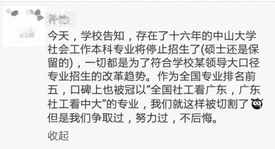 “中山大學(xué)社會(huì)工作專業(yè)的辦學(xué)質(zhì)量在我國(guó)高校同學(xué)科中一直排名靠前,且在行業(yè)中有著重要的影響力,此次停招事件對(duì)業(yè)界而言是一種遺憾,但它不是第一家,也不會(huì)是最后一家?!?/p> 面對(duì)記者關(guān)于中山大學(xué)社會(huì)工作專業(yè)本科停招事件的提問(wèn),國(guó)家開(kāi)放大學(xué)社會(huì)工作學(xué)院執(zhí)行院長(zhǎng)史柏年作出了這樣的回應(yīng)。 2017年5月6日晚間,面對(duì)社會(huì)諸多猜疑,中山大學(xué)黨委宣傳部副部長(zhǎng)王麗霞公開(kāi)回應(yīng)稱:中山大學(xué)社會(huì)工作專業(yè)并未停止今年秋季招生工作,而是進(jìn)行了招生制度改革,在招生的時(shí)候與社會(huì)學(xué)專業(yè)一同進(jìn)行寬口徑大類招生。然后僅僅1小時(shí)后,該回應(yīng)即修改為:“中山大學(xué)社會(huì)工作專業(yè)今年秋季暫停招收本科生?!?/p> 緣何暫停招生? 記者調(diào)查了解到,擬停招的社會(huì)工作專業(yè)屬于中山大學(xué)社會(huì)學(xué)與人類學(xué)學(xué)院下設(shè)的社會(huì)學(xué)與社會(huì)工作系,該專業(yè)于2000年設(shè)置成立,旨在培養(yǎng)理論與實(shí)踐相結(jié)合的社工人才,使學(xué)生在社會(huì)管理和社會(huì)服務(wù)機(jī)構(gòu)既能從事實(shí)務(wù)工作,又能從事策劃與管理工作。 本科期間開(kāi)設(shè)包括社會(huì)工作導(dǎo)論、個(gè)案工作、小組工作、社區(qū)工作、人類行為與社會(huì)環(huán)境、社會(huì)政策、社會(huì)福利、社會(huì)工作理論、社會(huì)學(xué)概論、社會(huì)工作研究方法、心理學(xué)導(dǎo)論共計(jì)11門(mén)社會(huì)專業(yè)必修課程。該專業(yè)于2004年獲批招收碩士研究生,2009年獲得全國(guó)首批社會(huì)工作碩士專業(yè)學(xué)位(MSW)的授予權(quán)。 5月7日,數(shù)十名中山大學(xué)社會(huì)工作專業(yè)畢業(yè)生聯(lián)名發(fā)表致校長(zhǎng)公開(kāi)信,對(duì)中山大學(xué)社工專業(yè)本科將停止招生的消息表示痛心和困惑,并提出3點(diǎn)質(zhì)疑: 1、“暫?!闭惺丈鐣?huì)工作本科生是否有官方文件; 2、“暫?!闭惺丈鐣?huì)工作本科生的具體規(guī)定為何(暫停期限多久?細(xì)則為何?在校師生如何安置?) 3、學(xué)生為何事先對(duì)“暫停招生的決策一無(wú)所知?” 5月7日,中山大學(xué)通過(guò)其官方微信回應(yīng)稱學(xué)校是依法依規(guī)開(kāi)展本科專業(yè),根據(jù)《中華人民共和國(guó)高等教育法》、《中山大學(xué)章程》相關(guān)規(guī)定,學(xué)校依法及國(guó)家相關(guān)政策享有“設(shè)置和調(diào)整學(xué)科、專業(yè)及相應(yīng)的學(xué)生培養(yǎng)方案”,“設(shè)立、變更和撤銷教學(xué)單位、學(xué)術(shù)研究機(jī)構(gòu)、學(xué)術(shù)管理組織、行政職能部門(mén)等內(nèi)部組織機(jī)構(gòu)”等權(quán)利。 中山大學(xué)校方表示從2017年3月份開(kāi)始近2個(gè)月時(shí)間,開(kāi)展包括校內(nèi)專家現(xiàn)場(chǎng)考察(抽查部分院系)、校外專家審核(抽查部分院系)、國(guó)家高等教育質(zhì)量常態(tài)檢測(cè)數(shù)據(jù)中心(廣州)專業(yè)辦學(xué)數(shù)據(jù)分析(評(píng)價(jià)指標(biāo)為生源質(zhì)量、本科師生比、學(xué)生國(guó)內(nèi)外交流情況、本科生深造率、教授為本科生上課率、調(diào)停課率、公選課師均開(kāi)課門(mén)次)等多種形式在內(nèi)的綜合評(píng)估后,決定對(duì)包括社會(huì)工作專業(yè)、財(cái)政學(xué)、應(yīng)用統(tǒng)計(jì)學(xué)、經(jīng)濟(jì)學(xué)在內(nèi)的18個(gè)專業(yè)進(jìn)行調(diào)整或暫停,通過(guò)優(yōu)化學(xué)科專業(yè)結(jié)構(gòu),完善本科專業(yè)設(shè)置的頂層設(shè)計(jì),使本科人才培養(yǎng)具有更寬的口徑,更符合學(xué)校的人才培養(yǎng)目標(biāo),更有利于本科生畢業(yè)后的發(fā)展和成長(zhǎng)。 始料不及的輿論反響 對(duì)于突如其來(lái)的停招,不僅讓中山大學(xué)在校師生措手不及,也讓行業(yè)人士感到錯(cuò)愕和惋惜,而在愈演愈烈的輿論聲中,作為曾任中山大學(xué)社會(huì)學(xué)系主任(中山大學(xué)社會(huì)學(xué)與人類學(xué)院前身)的蔡禾教授對(duì)停招事件作出了回應(yīng): 中大停招社工本科生為什么在全國(guó)乃至媒體引起如此大影響,我以為問(wèn)題在于: 1、從本科人才培養(yǎng)的數(shù)量來(lái)講,中大停辦本科專業(yè)對(duì)全國(guó)的影響不大,但在國(guó)家大力推動(dòng)發(fā)展社工(改革開(kāi)放以來(lái),惟有社工是國(guó)家十余家部委兩次發(fā)文,要大力發(fā)展的),開(kāi)展社會(huì)建設(shè),完善社會(huì)治理的時(shí)代背景下,這樣的決定顯然是與之相悖的; 2、中大是全國(guó)最早興辦社工的高校,其辦學(xué)質(zhì)量也是位于前列的,這次有如此大的反響恰恰說(shuō)明了中大社工專業(yè)的辦學(xué)地位和學(xué)科影響力,把一個(gè)辦的如此有影響的本科專業(yè)停掉是非常可惜的。也正因?yàn)槿绱?,它也向社工事業(yè)的發(fā)展釋放了一個(gè)負(fù)面信號(hào); 3、對(duì)于一個(gè)大學(xué)而言,選擇發(fā)展什么專業(yè)是有自主權(quán)的,但是在做出如此重大調(diào)整的決策之前,做充分的調(diào)研,了解不