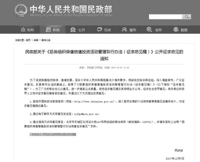 12月7日,民政部公布了《慈善組織保值增值投資活動管理暫行辦法(征求意見稿)》(以下簡稱《辦法》),并向社會公開征求意見。意見反饋截止時間為2018年1月6日。 《辦法》共二十五條,對慈善組織為實現(xiàn)財產(chǎn)保值增值開展投資活動的基本原則,投資范圍、模式及條件,投資決策運行、投資風(fēng)險控制、監(jiān)督管理等方面進行了規(guī)范。 《辦法》強調(diào)慈善組織開展投資必須服從服務(wù)于慈善財產(chǎn)的保值增值,而不能是其他目的?!掇k法》明確了慈善組織可開展投資活動的方式,同時強調(diào)慈善組織的財產(chǎn)不得用于直接投資二級市場股票等十二項活動。 遵循合法、安全、有效原則 保值增值一直是慈善組織財產(chǎn)管理的難點,也一直沒有相關(guān)的具體規(guī)定。《慈善法》出臺后,這一狀況有了變化。 《慈善法》第五十四條規(guī)定,慈善組織為實現(xiàn)財產(chǎn)保值、增值進行投資的,應(yīng)當遵循合法、安全、有效的原則,投資取得的收益應(yīng)當全部用于慈善目的。慈善組織的重大投資方案應(yīng)當經(jīng)決策機構(gòu)組成人員三分之二以上同意。政府資助的財產(chǎn)和捐贈協(xié)議約定不得投資的財產(chǎn),不得用于投資。慈善組織的負責人和工作人員不得在慈善組織投資的企業(yè)兼職或者領(lǐng)取報酬。前款規(guī)定事項的具體《辦法》,由國務(wù)院民政部門制定。 根據(jù)這一規(guī)定,民政部開展了相關(guān)課題的調(diào)查研究,征求了有關(guān)部門、專家和慈善組織的意見建議,在此基礎(chǔ)上形成了《慈善組織保值增值投資活動管理暫行辦法》(征求意見稿)》 《辦法》貫徹了《慈善法》的這些規(guī)定,強調(diào)使命第一,投資次之。 《辦法》強調(diào):慈善組織接受的政府資助的財產(chǎn)和捐贈協(xié)議約定不得投資的財產(chǎn),不得用于投資。慈善組織可以用于投資的財產(chǎn)限于非限定性資產(chǎn)、在投資期間暫不需要撥付的限定性資產(chǎn)。慈善組織應(yīng)當保持足夠的現(xiàn)金類資產(chǎn),以保證連續(xù)3年的慈善活動支出符合法定要求和待撥捐贈財產(chǎn)及時足額撥付。 不得直接投資二級市場股票 按照安全至上的原則,《辦法》為慈善組織的投資活動劃出了底線。 投資方式上,除銀行存款和接受股權(quán)捐贈之外,可用的方式有三種: 第一種,購買商業(yè)銀行、證券公司、基金管理公司、信托公司、保險資產(chǎn)管理公司等金融機構(gòu)發(fā)行發(fā)售的理財產(chǎn)品、債券、證券投資基金、信托產(chǎn)品等投資品種。 《辦法》規(guī)定慈善組織直接購買的理財產(chǎn)品限于自主風(fēng)險評級為風(fēng)險水平最低的一級或者二級。 慈善組織直接購買的債券限于國債和其他政府債券,政策性、開放性銀行債券,以及信用評級機構(gòu)評定的AAA級的企業(yè)(公司)債券和金融債券,鼓勵投資綠色債券。 慈善組織直接購買的信托產(chǎn)品限于融資類集合資金信托計劃和專門為慈善組織設(shè)計、發(fā)行的單一資金信托計劃,信用等級不低于國內(nèi)信用評級機構(gòu)評定的A級或者相當于A級的信用級別。 第二種,委托專業(yè)投資管理機構(gòu)管理和運作財產(chǎn)。 《辦法》強調(diào),慈善組織委托的專業(yè)投資管理機構(gòu)應(yīng)當具備下列條件:在中國境內(nèi)注冊,經(jīng)國務(wù)院金融監(jiān)督管理機構(gòu)批準成立的,具有相應(yīng)業(yè)務(wù)資格的金融機構(gòu);該公司凈資產(chǎn)不低于實收資本的50%;具有3年以上在中國境內(nèi)從事投資管理業(yè)務(wù)的經(jīng)驗和穩(wěn)定投資業(yè)績,且管理審慎,信譽較高,最近3年未發(fā)生重大違規(guī)行為。 慈善組織應(yīng)當與投資管理機構(gòu)簽訂委托財產(chǎn)管理合同,依照法律法規(guī)和本《辦法》對雙方的權(quán)利義務(wù)、委托財產(chǎn)管理方式、投資范圍、投資收益分配、違約責任以及解除合同的情形等內(nèi)容作出規(guī)定。 慈善組織應(yīng)當定期對投資管理機構(gòu)的管理業(yè)績和管理風(fēng)險進行評估。 第三種,直接進行與慈善組織宗旨和業(yè)務(wù)范圍直接相關(guān)的股權(quán)投資。 除了被投資方的經(jīng)營范圍與慈善組織的宗旨和業(yè)務(wù)范圍直接相關(guān)的情形,即開展扶貧濟困、支持困難群體就業(yè)創(chuàng)業(yè)等慈善活動所需要進行的股權(quán)投資以外,慈善組織不得進行其他直接的股權(quán)投資。 這既減少了慈善組織通過直接成立營利性企業(yè)進行利益輸送的可能;也防止捐贈財產(chǎn)轉(zhuǎn)變?yōu)殚L期股權(quán)后喪失了流動性,影響慈善活動支出。 《辦法》還明確了禁止慈善組織開展的十二項活動:1、在非銀行金融機構(gòu)存款;2、直接投資二級市場股票;3、投資人身保險產(chǎn)品;4、投資期貨、期權(quán)、遠期、互換等金融衍生產(chǎn)品,用于對沖風(fēng)險的除外;5、不具有穩(wěn)定現(xiàn)金流回報預(yù)期或者資產(chǎn)增值價值的投資;6、向個人、企業(yè)直接提供與本組織宗旨和業(yè)務(wù)范圍規(guī)定的慈善活動無關(guān)的借款;7、違法開展保證、抵押,以及將慈善組織的財產(chǎn)用于與組織宗旨和業(yè)務(wù)范圍規(guī)定的慈善活動無關(guān)的質(zhì)押;8、將慈善組織的財產(chǎn)