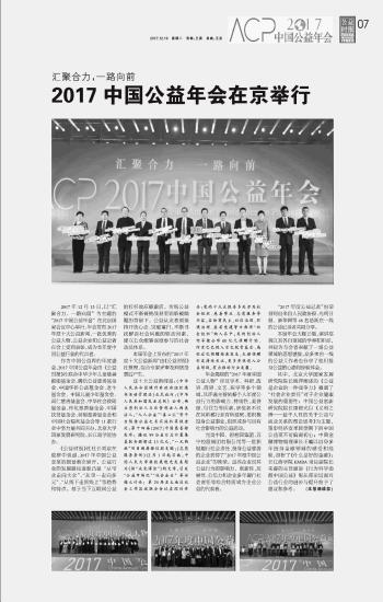 2017年12月13日,以“”為主題的“2017中國公益年會”在北京國家會議中心舉行,年會發(fā)布2017年度十大公益新聞,一批優(yōu)秀的公益人物、公益企業(yè)和公益記者在會上受到表彰,成為本年度中國公益行業(yè)的代言者。