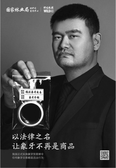 2017年12月29日下午,國家林業(yè)局官方微博聯(lián)合國際環(huán)保組織“野生救援”發(fā)布由公益大使姚明拍攝的最新公益廣告《以法律之名,讓象牙不再是商品》,呼吁公眾遵守法律禁止象牙買賣。2017年12月31日,中國禁止國內象牙商業(yè)性貿易全面實現(xiàn)。從這一天開始,買賣象牙在中國大陸是違法行為,將面臨法律制裁。