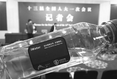 今年全國兩會的會場及代表團駐地的礦泉水瓶上,一款環(huán)保標簽被貼在上面。在這個綠色標簽上,印有中英文的“給水瓶做記號,并請喝完”,喝不完的鼓勵帶走。和光滑的塑料標簽不同,在這款標簽上,用筆可以輕松寫下名字。沒有筆也沒關系,用指甲輕輕一劃也可以寫文字。