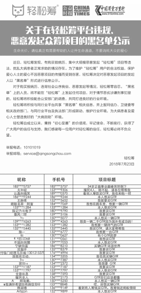 7月10日,輕松籌截獲并關(guān)閉該平臺(tái)個(gè)人求助版塊上于當(dāng)日發(fā)起的“眾籌喪葬費(fèi)”項(xiàng)目,將該違規(guī)項(xiàng)目籌集到的資金原路退回; 7月12日,輕松籌又截獲和關(guān)停在幾分鐘內(nèi)發(fā)起的2000多例“購(gòu)買(mǎi)GTR”“購(gòu)買(mǎi)邁凱倫”等惡意籌款項(xiàng)目,對(duì)所涉資金進(jìn)行凍結(jié),并向公安機(jī)關(guān)報(bào)案…… 實(shí)際上,從大病眾籌平臺(tái)誕生至今的四年時(shí)間內(nèi),違規(guī)、惡意項(xiàng)目的發(fā)起時(shí)常困擾著各家平臺(tái),消耗大眾的愛(ài)心的同時(shí),也對(duì)大病救助這一領(lǐng)域的氛圍造成了負(fù)面影響,嚴(yán)重阻礙行業(yè)發(fā)展。 近日,面對(duì)今年接踵襲來(lái)的以假病歷發(fā)起項(xiàng)目、違規(guī)和惡意項(xiàng)目等事件,輕松籌決定正面著手解決這類(lèi)困擾整個(gè)大病救助領(lǐng)域的“亂象”,推出“黑名單”機(jī)制,對(duì)惡意求助者采取“零容忍”態(tài)度,并與同行業(yè)平臺(tái)共享“黑名單”信息,以期共同為大病患者和愛(ài)心公眾塑造良好的大病救助環(huán)境。 第一份行業(yè)“黑名單” 7月23日,輕松籌發(fā)布我國(guó)第一份大病眾籌領(lǐng)域“黑名單”,將目前輕松籌個(gè)人求助版塊上惡意項(xiàng)目的發(fā)起人予以信息公示。 輕松籌表示,對(duì)于購(gòu)買(mǎi)病歷、違背社會(huì)公序良俗、惡意發(fā)起等情況采取“零容忍”態(tài)度?!昂诿麊巍鄙系娜藛T,將不能在輕松籌上發(fā)起任何項(xiàng)目,對(duì)于情節(jié)惡劣涉嫌刑事犯罪的,輕松籌還將積極配合公安部門(mén)進(jìn)行調(diào)查。 自2014年以來(lái),隨著互聯(lián)網(wǎng)技術(shù)的不斷成熟,借助“熟人社交”的優(yōu)勢(shì),數(shù)家大病眾籌平臺(tái)如雨后春筍般出現(xiàn),讓無(wú)力支付醫(yī)療費(fèi)用的大病患者找到了生的希望,更讓公眾不斷擴(kuò)大的愛(ài)心釋放需求得到滿(mǎn)足。 然而,4年來(lái),也常有不符合發(fā)起條件的眾籌項(xiàng)目出現(xiàn)在各家平臺(tái)之上,更有甚者惡意發(fā)起違規(guī)項(xiàng)目,罔顧這一行為對(duì)大病救助領(lǐng)域的環(huán)境破壞。2016年實(shí)施的《慈善法》并未對(duì)個(gè)人求助領(lǐng)域進(jìn)行規(guī)制,也一定程度上讓惡意發(fā)起者無(wú)所忌憚。 此次輕松籌發(fā)布“黑名單”是行業(yè)首度正面這一問(wèn)題,極大增加了惡意發(fā)起者擾亂正常秩序的成本和難度,從而維護(hù)輕松籌用戶(hù)的合法權(quán)益,保護(hù)愛(ài)心人士的愛(ài)心不因惡意項(xiàng)目的傳播而受到傷害。 近探“黑名單” 記者發(fā)現(xiàn),“黑名單”首批記錄的500組信息中,其項(xiàng)目標(biāo)題以含有“購(gòu)買(mǎi)GTR”字樣居多,另有一些不堪入目的籌款請(qǐng)求,的確為惡意發(fā)起行為。 在此十余天前,輕松籌就曾于短短幾分鐘內(nèi)接到大量“購(gòu)買(mǎi)GTR”“購(gòu)買(mǎi)邁凱倫”“購(gòu)買(mǎi)帕拉梅拉”的惡意籌款項(xiàng)目申請(qǐng),數(shù)量竟達(dá)到2000多例。平臺(tái)工作人員與發(fā)起者取得聯(lián)系時(shí),不少人竟表示是為了“好玩兒”。輕松籌第一時(shí)間關(guān)停了這些項(xiàng)目、凍結(jié)所籌資金,并向公安機(jī)關(guān)報(bào)案。 與大多數(shù)大病眾籌平臺(tái)相似,輕松籌平臺(tái)的用戶(hù)在注冊(cè)時(shí)需填入有效手機(jī)號(hào)碼,此次“黑名單”所公示的手機(jī)號(hào)碼將不能再用于注冊(cè)和發(fā)起籌款項(xiàng)目,也就在很大程度上避免了惡意發(fā)起人再次注冊(cè)新ID來(lái)發(fā)起新項(xiàng)目,這將大規(guī)模減少惡意項(xiàng)目的申請(qǐng)。 此外,日前備受關(guān)注的“眾籌喪葬費(fèi)”項(xiàng)目的發(fā)起人信息也被“黑名單”登記在案,這意味著,今后用戶(hù)在發(fā)起項(xiàng)目時(shí)需謹(jǐn)慎比照項(xiàng)目發(fā)起條件,莫將不屬于大病救助類(lèi)別的籌款在平臺(tái)上發(fā)起。 輕松籌表示,個(gè)人籌款通道應(yīng)為大病患者專(zhuān)用,目前平臺(tái)上每天都有很多患者和家庭在急切地等待幫助,應(yīng)為他們讓出寶貴的生命通道。 推動(dòng)行業(yè)共建相關(guān)機(jī)制 作為大病眾籌領(lǐng)域的領(lǐng)頭羊,輕松籌不但發(fā)布首份“黑名單”,更考慮到各家平臺(tái)對(duì)惡意項(xiàng)目的發(fā)起都深?lèi)和唇^,決定將與同行業(yè)平臺(tái)共享“黑名單”相關(guān)信息,打造行業(yè)機(jī)制。 在該機(jī)制下,除分享“黑名單”信息外,輕松籌還將信息上報(bào)網(wǎng)信辦、衛(wèi)健委等相關(guān)政府部門(mén)。 輕松籌表示:“生命無(wú)價(jià),請(qǐng)給真正有需要幫助的人讓開(kāi)生命通道,不要消耗大眾的愛(ài)心。輕松籌將與與同行業(yè)平臺(tái)及執(zhí)法部門(mén)形成聯(lián)動(dòng),維護(hù)行業(yè)環(huán)境,為大病患者及愛(ài)心人士塑造良好的大病救助環(huán)境。’” ■ 本報(bào)記者 高文興 |