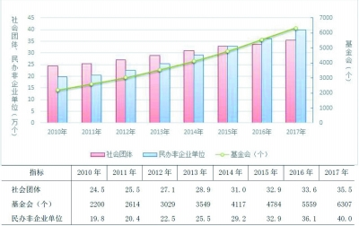 近日,民政部發(fā)布了《2017 年社會(huì)服務(wù)發(fā)展統(tǒng)計(jì)公報(bào)》。統(tǒng)計(jì)公報(bào)顯示,全年共接收社會(huì)捐款754.2億元,其中:民政部門(mén)直接接收社會(huì)各界捐款25.0億元,各類(lèi)社會(huì)組織接收捐款729.2億元。 社會(huì)捐款754.2億元 《統(tǒng)計(jì)公報(bào)》顯示,截至2017年底,全國(guó)共建立經(jīng)常性社會(huì)捐助工作站、點(diǎn)和慈善超市2.8萬(wàn)個(gè)(其中:慈善超市8969個(gè))。 全年共接收社會(huì)捐款754.2億元,其中:民政部門(mén)直接接收社會(huì)各界捐款25.0億元,各類(lèi)社會(huì)組織接收捐款729.2億元。 全年各地民政部門(mén)直接接收捐贈(zèng)物資價(jià)值折合人民幣1.1億元,間接接收其他部門(mén)轉(zhuǎn)入的捐贈(zèng)物資折款0.7億元,社會(huì)捐款10.3億元。全年有582.8萬(wàn)人次困難群眾受益。 全年有1716.4萬(wàn)人次在社會(huì)服務(wù)領(lǐng)域提供了5395.6萬(wàn)小時(shí)的志愿服務(wù)。 此外,2017年中國(guó)福利彩票銷(xiāo)售2169.8億元,比上年增加104.9億元,增長(zhǎng)5.1%。全年籌集福利彩票公益金631.1億元,比上年增長(zhǎng)6.7%。全年民政系統(tǒng)共支出彩票公益金275.2億元,比上年增長(zhǎng)2.6%,其中用于撫恤6.2億元,社會(huì)福利173.6億元,社會(huì)救助35.4億元,自然災(zāi)害生活救助3.5億元。 社會(huì)組織76.2萬(wàn)個(gè) 截至2017年底,全國(guó)共有社會(huì)組織76.2萬(wàn)個(gè),比上年增長(zhǎng)8.4%;吸納社會(huì)各類(lèi)人員就業(yè)864.7萬(wàn)人,比上年增長(zhǎng)13.2%。全年共查處社會(huì)組織違法違規(guī)案件4293起,行政處罰4270起。 全國(guó)共有社會(huì)團(tuán)體35.5萬(wàn)個(gè),比上年增長(zhǎng)5.6%,其中:工商服務(wù)業(yè)類(lèi)3.9萬(wàn)個(gè),科技研究類(lèi)1.5萬(wàn)個(gè),教育類(lèi)1.0萬(wàn)個(gè),衛(wèi)生類(lèi)0.9萬(wàn)個(gè),社會(huì)服務(wù)類(lèi)4.8萬(wàn)個(gè),文化類(lèi)3.9萬(wàn)個(gè),體育類(lèi)3.0萬(wàn)個(gè),生態(tài)環(huán)境類(lèi)0.6萬(wàn)個(gè),法律類(lèi)0.3萬(wàn)個(gè),宗教類(lèi)0.5萬(wàn)個(gè),農(nóng)業(yè)及農(nóng)村發(fā)展類(lèi)6.2萬(wàn)個(gè),職業(yè)及從業(yè)組織類(lèi)2.0萬(wàn)個(gè),其他6.8萬(wàn)個(gè)。全年共查處社會(huì)團(tuán)體違法違規(guī)案件2375起,行政處罰2352起。 全國(guó)共有各類(lèi)基金會(huì)6307個(gè),比上年增長(zhǎng)13.5%,其中:公募基金會(huì)1678個(gè),非公募基金會(huì)4629個(gè);民政部登記的基金會(huì)213個(gè)。全年共查處基金會(huì)違法違規(guī)案件49起,行政處罰49起。 全國(guó)共有民辦非企業(yè)單位40.0萬(wàn)個(gè),比上年增長(zhǎng)11.0%,其中:科技服務(wù)類(lèi)1.6萬(wàn)個(gè),生態(tài)環(huán)境類(lèi)501個(gè),教育類(lèi)21.7萬(wàn)個(gè),衛(wèi)生類(lèi)2.7萬(wàn)個(gè),社會(huì)服務(wù)類(lèi)6.2萬(wàn)個(gè),文化類(lèi)2.1萬(wàn)個(gè),體育類(lèi)1.8萬(wàn)個(gè),法律類(lèi)1197個(gè),工商業(yè)服務(wù)類(lèi)3652個(gè),宗教類(lèi)115個(gè),國(guó)際及其他涉外組織類(lèi)15個(gè),其他3.0萬(wàn)個(gè)。全年共查處民辦非企業(yè)單位違法違規(guī)案件1869起,行政處罰1869起。 持證社工32.7萬(wàn)人 《統(tǒng)計(jì)公報(bào)》顯示,截至2017年底全國(guó)持證社會(huì)工作者共計(jì)32.7萬(wàn)人,其中社會(huì)工作師8.3萬(wàn)人,助理社會(huì)工作師24.3萬(wàn)人。 截至2017年底,全國(guó)注冊(cè)登記的提供住宿的各類(lèi)社會(huì)服務(wù)機(jī)構(gòu)3.2萬(wàn)個(gè),其中注冊(cè)登記為事業(yè)單位的機(jī)構(gòu)1.8萬(wàn)個(gè),注冊(cè)登記為民辦非企業(yè)單位的機(jī)構(gòu)1.3萬(wàn)個(gè)。 其中,各類(lèi)養(yǎng)老服務(wù)機(jī)構(gòu)和設(shè)施15.5萬(wàn)個(gè),比上年增長(zhǎng)10.6%,其中:注冊(cè)登記的養(yǎng)老服務(wù)機(jī)構(gòu)2.9萬(wàn)個(gè),社區(qū)養(yǎng)老機(jī)構(gòu)和設(shè)施4.3萬(wàn)個(gè),社區(qū)互助型養(yǎng)老設(shè)施8.3萬(wàn)個(gè);各類(lèi)養(yǎng)老床位合計(jì)744.8萬(wàn)張,比上年增長(zhǎng)2%(每千名老年人擁有養(yǎng)老床位30.9張),其中社區(qū)留宿和日間照料床位338.5萬(wàn)張。 兒童收養(yǎng)救助服務(wù)機(jī)構(gòu)663個(gè),床位10.3萬(wàn)張,年末收留撫養(yǎng)各類(lèi)人員5.9萬(wàn)人。其中兒童福利機(jī)構(gòu)469個(gè),床位9.5萬(wàn)張;未成年人救助保護(hù)中心194個(gè),床位0.8萬(wàn)張,全年共救助流浪乞討未成年人3.5萬(wàn)人次。 各類(lèi)救助管理機(jī)構(gòu)1623個(gè),床位10.1萬(wàn)張,全年救助生活無(wú)著流浪乞討人員215.4萬(wàn)人次(在站救助163.1萬(wàn)人次,站外救助52.3萬(wàn)人次)。 2.4090億老年人 《統(tǒng)計(jì)公報(bào)》顯示,截至2017年底,全國(guó)60周歲及以上老年人口24090萬(wàn)人,占總?cè)丝诘?7.3%,其中65周歲及以上老年人口15831萬(wàn)人,占總?cè)丝诘?1.4%。全國(guó)共有老齡事業(yè)單位1600個(gè),老年法律援助中心2.0萬(wàn)個(gè),老年維權(quán)協(xié)調(diào)組織6.4萬(wàn)個(gè),老年學(xué)校4.9萬(wàn)個(gè)、在校學(xué)習(xí)人員704.0萬(wàn)人,各類(lèi)老年活動(dòng)室35.0萬(wàn)個(gè);享受高齡補(bǔ)貼的老年人2682.2萬(wàn)人,比上年增長(zhǎng)13.9%;享受護(hù)理補(bǔ)貼的老年人61.3萬(wàn)人,比上年增長(