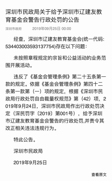 ■ 本報(bào)記者 文梅 9月25日,深圳市民政局發(fā)布《關(guān)于給予深圳市遼建友教育基金會(huì)警告行政處罰的公告》?!豆妗访鞔_,深圳市遼建友教育基金會(huì)存在以下問題: 未按照章程規(guī)定的宗旨和公益活動(dòng)的業(yè)務(wù)范圍開展活動(dòng)。 違反了《基金會(huì)管理?xiàng)l例》第二十五條第一款的規(guī)定。依據(jù)《基金會(huì)管理?xiàng)l例》第四十二條第一款第(一)項(xiàng)的規(guī)定,根據(jù)《深圳市民政局行政處罰自由裁量權(quán)規(guī)范》第(42)項(xiàng),2019年9月24日,深圳市民政局作出行政處罰決定(深民罰字〔2019〕第001號(hào)),給予深圳市遼建友教育基金會(huì)警告的行政處罰,并責(zé)令其改正相關(guān)違法違規(guī)行為。 此前,關(guān)于深圳市遼建友教育基金會(huì)“未按照章程規(guī)定的宗旨和公益活動(dòng)的業(yè)務(wù)范圍開展活動(dòng)”的問題,《公益時(shí)報(bào)》于6月份進(jìn)行了報(bào)道。 深圳市遼建友教育基金會(huì)(以下簡稱‘遼建友基金會(huì)’)設(shè)立“財(cái)智投資基金”,以“公益捐存”的方式,承諾預(yù)期回報(bào),面向沈陽建筑大學(xué)校友群體公開募捐。 該報(bào)道源自微信網(wǎng)友“簡出橋”先生的反饋,稱其發(fā)現(xiàn)深圳市遼建友教育基金會(huì)在微信公眾號(hào)對(duì)其運(yùn)作的“財(cái)智投資基金”公益捐存項(xiàng)目描述如下——基金會(huì)按照章程使用籌款項(xiàng)及其增值收益,并向捐贈(zèng)人支付按中國人民銀行同期人民幣存款基準(zhǔn)利率計(jì)算的存款利息,在投資周期結(jié)束后,捐贈(zèng)人可以按照自己的意愿全額收回捐贈(zèng)存款(捐存)的本金和存款利息。簡出橋認(rèn)為遼建友基金會(huì)的“公益捐存”項(xiàng)目涉嫌違法,遂向深圳市民政局和《公益時(shí)報(bào)》進(jìn)行了舉報(bào)。 經(jīng)過《公益時(shí)報(bào)》記者多方了解調(diào)查,簡出橋反映的情況屬實(shí),且遼建友基金會(huì)亦不愿主動(dòng)就此事予以解釋和說明。 該報(bào)道刊發(fā)后引起業(yè)界廣泛關(guān)注?!豆鏁r(shí)報(bào)》獲悉,報(bào)道刊發(fā)后,民政部執(zhí)法處已很快將此事交由深圳民政主管部門調(diào)查處理。 在此后的跟蹤報(bào)道采訪中,深圳市民政局執(zhí)法監(jiān)督處工作人員向記者表示,深圳民政局執(zhí)法部門會(huì)嚴(yán)格按照相關(guān)執(zhí)法流程推進(jìn)此事,無論調(diào)查結(jié)果如何,一定會(huì)及時(shí)通過公開渠道予以公示。 三個(gè)月后,深圳市民政局通過其官網(wǎng)“深圳民政在線”就此事發(fā)布公告,稱“給予深圳市遼建友教育基金會(huì)警告行政處罰”,深圳市政府官方網(wǎng)站亦對(duì)此公告進(jìn)行了轉(zhuǎn)載。 |