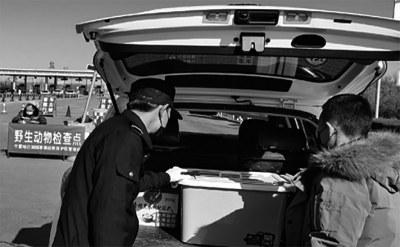 2020年2月2日,在寧夏鹽池縣青銀高速公路花馬池出入口野生動(dòng)物檢查點(diǎn),工作人員檢查即將駛出的車(chē)輛