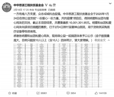 今年2月份,中華思源工程扶貧基金會公示了在抗疫期間明星粉絲團的愛心捐贈數(shù)據(jù),自1月24日在微公益發(fā)起“一份愛心一份力量,共抗疫情”項目后,截至項目結(jié)束,共募集善款超1000萬元。