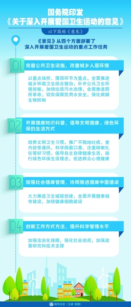 為深入貫徹習(xí)近平總書(shū)記關(guān)于愛(ài)國(guó)衛(wèi)生工作的重要指示精神,落實(shí)黨中央、國(guó)務(wù)院決策部署,繼承和發(fā)揚(yáng)愛(ài)國(guó)衛(wèi)生運(yùn)動(dòng)優(yōu)良傳統(tǒng),充分發(fā)揮愛(ài)國(guó)衛(wèi)生運(yùn)動(dòng)的制度優(yōu)勢(shì)、組織優(yōu)勢(shì)、文化優(yōu)勢(shì)和群眾優(yōu)勢(shì),將愛(ài)國(guó)衛(wèi)生運(yùn)動(dòng)與傳染病、慢性病防控等緊密結(jié)合,全面改善人居環(huán)境,加快形成文明健康、綠色環(huán)保的生活方式,有效保障人民群眾健康,11月27日,國(guó)務(wù)院印發(fā)的《關(guān)于深入開(kāi)展愛(ài)國(guó)衛(wèi)生運(yùn)動(dòng)的意見(jiàn)》對(duì)外公布。
