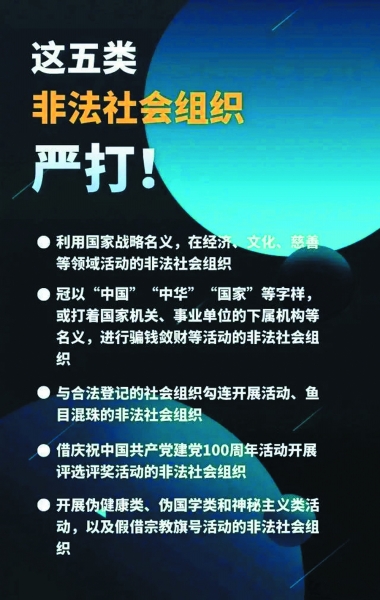 ■ 本報記者 王勇 日前,民政部等多部門聯(lián)合印發(fā)的《關(guān)于鏟除非法社會組織滋生土壤凈化社會組織生態(tài)空間的通知》(以下簡稱《通知》),引起社會各方廣泛關(guān)注。民政部負責同志就《通知》有關(guān)問題答記者問,強調(diào)打擊整治非法社會組織是一項系統(tǒng)工程,需要做多方面的工作。 “《通知》的核心精神和內(nèi)容可以概括為‘六不得一提高’,以列舉的方式提出了倡導性要求和禁止性規(guī)范,再一一對應(yīng)處理措施,可操作性強?!痹撠撠熑藦娬{(diào)。 “十四五”開局起步 “絆腳石” 非法社會組織是指未經(jīng)民政部門登記,擅自以社會組織名義開展活動的組織,以及被撤銷登記或吊銷登記證書后繼續(xù)以社會組織名義活動的組織,還包括籌備期間開展籌備以外活動的組織。 許多非法社會組織非常狡猾,絞盡腦汁用各種方式讓人信任其“真實性”和“權(quán)威性”,總結(jié)起來一般有以下幾種手法: 一是名稱讓人真假難辨。很多非法社會組織往往冠以“中國”“中華”“全國”“世界”等名頭,有的在名稱上與合法登記的全國性社會組織僅一字之差,網(wǎng)頁宣傳上抄襲合法社會組織的官網(wǎng)內(nèi)容,社會公眾難辨真假。 二是活動領(lǐng)域“蹭熱點”。非法社會組織善于打“擦邊球”,往往跟風“軍民融合”“鄉(xiāng)村振興”“疫情防控”等熱點,吸引眼球。 三是組織形式“品種繁多”。非法社會組織有的以“協(xié)會”“促進會”“聯(lián)合會”“基金會”等傳統(tǒng)社會組織形式活動;有的以“委員會”“發(fā)展局”“中心”等類似政府機關(guān)和事業(yè)單位的組織形式活動,令人防不勝防。 四是包裝宣傳“高大上”。有些非法社會組織特意在黨政機關(guān)辦公地附近或附屬場所租用辦公場地,有的拉攏一些退休黨政干部或社會名人“站臺”“代言”,有的找各種媒體為自己進行宣傳“貼金”,用各種手法增加其“可信度”。 五是用合法外衣做掩護。有的非法社會組織千方百計“投靠”到合法登記的社會組織名下,變身為分支機構(gòu);有的與合法社會組織共同開展活動;有的想方設(shè)法成為事業(yè)單位的下設(shè)機構(gòu),魚目混珠。 今年是中國共產(chǎn)黨百年華誕,是“十四五”規(guī)劃開局之年,是開啟全面建設(shè)社會主義現(xiàn)代化國家新征程的第一年?!胺欠ㄉ鐣M織歷來工于‘蹭熱點’,窺伺國際、國內(nèi)環(huán)境中蘊藏的‘商機’,以便牟取非法利益,對此,我們必須警醒?!痹撠撠熑藦娬{(diào)。 據(jù)該負責人介紹,這次民政部聯(lián)合有關(guān)部門,本著“標本兼治”的原則,亮利劍、出重拳,目的就是絕不允許非法社會組織成為“十四五”開局起步的“絆腳石”。 一方面,民政部、中央宣傳部、中央政法委等18個部門將聯(lián)合開展為期3個半月的進一步打擊整治非法社會組織專項行動。3月20日,召開了進一步打擊整治非法社會組織電視電話會議,向全國進行了動員和部署。此次專項行動,是繼2018年民政部、公安部聯(lián)合開展打擊整治非法社會組織專項行動以來的第二次專項行動。相比第一次專項行動,這次行動規(guī)模更廣、參與部門更多、打擊力度更強、措施更嚴厲,必將對非法社會組織形成壓倒性態(tài)勢。 另一方面,民政部聯(lián)合21個部門印發(fā)了這個《通知》。聯(lián)合發(fā)文參與部門之多、涉及面之廣、對策之精準,都是前所未有的,這既說明打擊整治非法社會組織涉及社會方方面面,需要全社會的共同參與,也說明各部門的心是齊的,認識是一致的,這對深入持久地打擊整治非法社會組織必將產(chǎn)生重要推動作用。 鏟除非法社會組織滋生土壤 與合法登記的社會組織相比,非法社會組織飄忽不定,“神出鬼沒”,但非法社會組織并非“不食人間煙火”,它們非常需要宣傳渠道、活動場所、資金來源、網(wǎng)絡(luò)營銷平臺以及各色人等的“捧場”,離開了以上條件的支持它們是無法存活的。 因此,《通知》開宗明義,著眼點是鏟除非法社會組織賴以生存的土壤,體現(xiàn)了系統(tǒng)治理、依法治理、綜合治理、源頭治理的思維,找準了非法社會組織的“七寸”。 比如,如果大家不去參加非法社會組織開展的活動,對非法社會組織頒發(fā)的獎牌、證書等不感興趣、不“知假買假”,非法社會組織就沒有了騙錢斂財?shù)氖袌?;新聞媒體在宣傳報道社會組織及人員的活動時,若事先“驗明正身”,不為非法社會組織背書,非法社會組織就無處擴大其影響力;如果黨員干部慎友慎獨慎微,隨時隨地牢記黨紀國法,依法依規(guī)參加社會組織活動,非法社會組織唬弄公眾的“權(quán)威背景”就會灰飛煙滅;如果各種公共活動場所不“唯利是圖”,特別是一些標志性的會議場館若不為非法社會組織提供“活動樂園”,非法社會組織就沒有了表演的“舞臺”等。 因此,打擊整治非法社會組織政府部門有責,社會方方面面也都有責、有戒,只有社會方方面面的力量都來共同參與,才可能真正實現(xiàn)《通知》提出的鏟除非法社會組織滋生土壤的目標。 《通知》的核心精神和內(nèi)容可以概括為“六不得一提高”,以列舉的方式提出了倡導性要求和禁止性規(guī)范,再一一對應(yīng)處理措施,可操作性強。 “六不得一提高”基本涵蓋了非法社會組