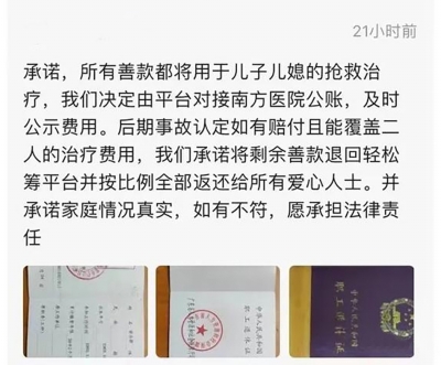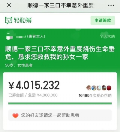 兩家人、同一車出行,不料遭遇汽車起火意外事故。日前,廣東佛山兩條來自輕松籌的籌款鏈接很快吸引數(shù)十萬人捐款,兩個(gè)遭遇不測(cè)的家庭600萬元的籌資目標(biāo)迅速完成。 在大家接力“慷慨解囊”的同時(shí),一些質(zhì)疑的聲音也開始出現(xiàn)。對(duì)此,記者采訪當(dāng)事人家屬及平臺(tái),對(duì)這一事件進(jìn)行調(diào)查。 兩家人同車出行 遭遇意外事故被燒傷 8月9日晚,一條名為“順德一家三口不幸意外重度燒傷生命垂危,懇求您救救我孫女一家”的第三方籌款鏈接,刷爆了廣東省佛山市順德區(qū)的市民朋友圈。 “看著可愛的孫女躺在病床上奄奄一息的樣子,我的心就像被刀切碎了一樣?!卑l(fā)起求助的,是其中一位女性傷者的父親。 這位父親稱,今年8月8日中午1時(shí),女兒一家在乘車中突然意外遭遇火災(zāi)造成特重度燒傷,隨后送到了醫(yī)院搶救。 求助鏈接放上了其女兒、女兒丈夫及孫女的燒傷治療照。病床上的傷者全身包裹著繃帶。鏈接上,發(fā)起求助者還公布了一家人的傷情,并曬出了醫(yī)院相關(guān)診斷書。其女兒何某全身多處特重度燒傷90%,孫女全身多處特重度燒傷85%,其女婿梁某則是頭部、四肢重度燒傷40%,傷情嚴(yán)重。 值得關(guān)注的是,在鏈接發(fā)出后當(dāng)晚,數(shù)小時(shí)400萬元款項(xiàng)就籌集完畢。 同車遭遇意外燒傷的還有另一家人。第二天(8月10日)傍晚,這一家人的籌資救助的鏈接也開始出現(xiàn)在市民的朋友圈上。據(jù)悉,其籌資目標(biāo)為200萬元。 發(fā)起救助的是傷者之一的父親。他稱,其兒子一家與另一家是“開著借用的車”出行,隨后突然出現(xiàn)意外(交警和消防正在調(diào)查起火事故原因)?!皟H僅幾秒鐘時(shí)間車廂里滿是火焰,兒子到第三排抱著我的小孫女拖著兒媳下車,孫女在爸爸的保護(hù)下面部、手臂和腿部也均有輕度燒傷,但夫妻兩人卻被大火包圍造成重度燒傷,所乘車輛也被燒成了空架子?!?/p> 鏈接上,求助者也放出了一家的救治照片,附上了診斷證明。據(jù)悉,這一家男性傷者徐某全身各處重度燒傷50%,其妻子盧某全身重度燒傷30%。而經(jīng)過一晚上,200萬元善款也籌資完成。 關(guān)于家庭財(cái)產(chǎn) “我說得實(shí)事求是” 接連兩天,佛山全社會(huì)為兩個(gè)家庭共籌資超過600萬元。記者了解到,在大家接力“慷慨解囊”的同時(shí),關(guān)于傷者家庭真實(shí)情況等一些質(zhì)疑的聲音開始出現(xiàn)。 針對(duì)質(zhì)疑,10日,輕松籌平臺(tái)上更新了一份關(guān)于傷者家庭財(cái)產(chǎn)情況的證明。記者看到,在證明文末的一行“經(jīng)核實(shí),該家庭為我社區(qū)非低保家庭,非低保臨界家庭”手寫字樣上,蓋上了傷者梁某所在居委會(huì)印章。 證明還提及了傷者梁某夫妻在北滘坤洲開設(shè)一間加工作坊,有一幢自建房,有一臺(tái)小轎車等。 對(duì)此,記者也第一時(shí)間就該份證明向蓋章單位進(jìn)行核實(shí)。據(jù)其所在的碧江村委會(huì)相關(guān)負(fù)責(zé)人介紹,該證明確實(shí)是經(jīng)居委會(huì)之手。 8月11日,記者找到了遭遇事故家庭之一傷者梁某的親哥哥。他回應(yīng)稱,對(duì)于網(wǎng)上提及的一些質(zhì)疑聲音,自己實(shí)話實(shí)說,“光明正大”。 “我弟弟的情況全都是真實(shí)的?!绷耗车母绺邕€表示,關(guān)于一些質(zhì)疑的聲音,自己暫時(shí)無暇顧及。當(dāng)務(wù)之急要籌資救人,讓家人脫離危險(xiǎn)?!俺霈F(xiàn)這樣的變故,誰都不愿意接受?!?/p> 關(guān)于治療費(fèi)用 “做好了賣房的準(zhǔn)備” 梁某的哥哥透露,當(dāng)前弟弟一家暫未脫離生命危險(xiǎn)。近段時(shí)間來,除安撫、陪伴傷者家庭,他還奔走在保險(xiǎn)公司、社保部門等,爭(zhēng)取更多權(quán)益。 因?yàn)椴辉诩本鹊谝滑F(xiàn)場(chǎng),梁某哥哥表示對(duì)上眾籌平臺(tái)一事了解不多,但也就緣何籌資400萬元進(jìn)行了回應(yīng)。 他稱,據(jù)收治其弟媳的廣州市紅十字會(huì)醫(yī)院給出的治療方案,全部治療費(fèi)用“保底”也要200萬元?!暗艿芎椭杜谀戏结t(yī)院,現(xiàn)在還沒脫離危險(xiǎn)期,醫(yī)院表示還無法給出具體的治療費(fèi)用。但是我坦誠(chéng)說,400萬元肯定是不夠的?!?/p> “我們已經(jīng)做好準(zhǔn)備了,將全部身家都拿出來,用來救人?!绷耗掣绺缁貞?yīng)記者,一家人已經(jīng)做好了“最壞打算”。“要先把我弟的房子賣了,如果還不夠的話,就把我爸的一個(gè)房子拿出來賣了,現(xiàn)在已經(jīng)做好這樣的準(zhǔn)備了。”他還表示,目前一家人也在等待事故原因的查明。 該籌款鏈接也發(fā)出了新的籌款動(dòng)態(tài)。其中上傳了三名患者費(fèi)用診斷證明,表示前期合計(jì)320萬元費(fèi)用缺口。 平臺(tái)回應(yīng) 已觸發(fā)“風(fēng)控機(jī)制” 在眾籌過程中,不少網(wǎng)友也對(duì)平臺(tái)提出質(zhì)疑,包括材料審核、籌款修改等。 8月10日,輕松籌平臺(tái)經(jīng)過內(nèi)部調(diào)查,并通過采訪函回復(fù)記者,此次順德燒傷家庭的籌款事宜,是輕松籌籌款顧問在醫(yī)院遇到了發(fā)起人,在發(fā)起人表達(dá)對(duì)籌款有需求后,其對(duì)項(xiàng)目發(fā)起的步驟及所需材料進(jìn)行了輔導(dǎo)。 那么,在該起求助信息中,平臺(tái)對(duì)于求助人的傷情,以及家庭