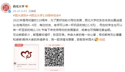 近日,西北大學(xué)官方微博發(fā)出的一則募捐倡議引發(fā)網(wǎng)友熱議。 今年,西北大學(xué)迎來建校119周年。該校校友總會號召校友、老師及學(xué)生,每月捐出一杯奶茶或一杯豆?jié){的錢,支持母校發(fā)展。 倡議發(fā)出后,引來網(wǎng)友調(diào)侃西北大學(xué)是“中國最窮211”。 10月18日,西北大學(xué)工作人員回應(yīng)稱,校友捐贈是大學(xué)經(jīng)費的來源之一,很多大學(xué)都有這種渠道。“我們是在法律框架下進行的,錢款的使用都會公示?!?/p> 募捐“一杯奶茶的錢” 10月14日,西北大學(xué)官方微博發(fā)布一則捐贈倡議。該校校友總會對校友、老師及在校學(xué)生發(fā)出號召:在每月的6~9日將一杯奶茶(11.9元)或一杯豆?jié){(1.19元)的錢節(jié)省下來支持母校發(fā)展建設(shè),或者也可捐贈任意金額,并在文字下方配有捐贈二維碼圖片。 倡議發(fā)出后,引來不少圍觀。對此,有網(wǎng)友表示“大為震驚”,并寫道“不是說缺一杯奶茶錢豆?jié){錢……倡議捐錢是長久之計嗎”。也有人認為,“雖然我也捐了,希望學(xué)校也越來越好,但是我覺得這個行為多多少少有點……” 其中也不乏網(wǎng)友調(diào)侃,“捐了,不要讓我沒學(xué)上”“俺們是真的樸”“中國最窮211,心酸,淚目”。 多的留言則是為西北大學(xué)“哭窮”:“在校到畢業(yè),感覺西大一直挺大方。這次雖說是倡議,但這樣伸手,看來真的缺錢了吧,救救西大”“太慘了太慘了……” 撞名美國著名的西北大學(xué),我國西北大學(xué)盡管實力不凡,卻顯得“不太知名”。實際上,擁有119年歷史的西北大學(xué)是我國西北地區(qū)辦學(xué)歷史最為悠久的高等學(xué)府。 官方簡介顯示,西北大學(xué)現(xiàn)為首批國家“世界一流學(xué)科建設(shè)高?!?、國家“211工程”建設(shè)院校、教育部與陜西省共建高校。 在2017年的第四輪學(xué)科評估中,該校有2個學(xué)科進入A類,16個學(xué)科進入前30%,學(xué)科整體實力和水平較第三輪學(xué)科評估有了較大提升。地球科學(xué)、材料科學(xué)、化學(xué)、工程學(xué)、臨床醫(yī)學(xué)、藥理學(xué)與毒理學(xué)等學(xué)科還進入ESI全球前1%行列。 中國“最窮”211? 由校友總會發(fā)起的一項募捐活動也許不代表西北大學(xué)校方試圖以這種方式獲得“大力支持”。但這并不妨礙網(wǎng)友們“借題發(fā)揮”,為西北大學(xué)“實慘”的經(jīng)費現(xiàn)狀而賣力“哭窮”。 當(dāng)前,陜西省共有8所“雙一流”高校,其中3所“一流大學(xué)建設(shè)高?!保次靼步煌ù髮W(xué)、西北工業(yè)大學(xué)、西北農(nóng)林科技大學(xué);5所“一流學(xué)科建設(shè)高校”,即西北大學(xué)、西安電子科技大學(xué)、長安大學(xué)、陜西師范大學(xué)、第四軍醫(yī)大學(xué)。 西北大學(xué)則是8所中唯一一所省屬高校,這成為影響其經(jīng)費來源的重要因素。 同在陜西的教育部直屬高校西交大、工信部直屬高校西工大的2021年經(jīng)費預(yù)算已躋身百億。其他4所陜西部屬“雙一流”——西電、西農(nóng)、長大、陜師大的預(yù)算總經(jīng)費分別為51.78億元、45.55億元、35.71億元、31.87億元。 作為陜西省屬高校,西北大學(xué)的預(yù)算經(jīng)費為14.18億元,和上面幾所高校相去甚遠。而這一數(shù)字已相較去年增加了5.73億,增長百分比高達67.8%。 在東西部之間、西部區(qū)域省份內(nèi)的高校經(jīng)費差距更加明顯。 2021年,同樣位于西部的四川省10所地方高校預(yù)算收入均超過10億元。再以省屬頭部高校為例,蘇州大學(xué)預(yù)算收入32.84億元,成都大學(xué)為24.3億元。 經(jīng)費捉襟見肘,西北大學(xué)產(chǎn)出卻不低。 據(jù)西北大學(xué)校長郭立宏透露,該校投入產(chǎn)出比位居全國高校前列。西北大學(xué)辦學(xué)經(jīng)費投入位列95所一流學(xué)科建設(shè)高校中下游,高層次人才引育成效和科研產(chǎn)出則分列第8和第24位。 西北大學(xué)官微在一篇題為《西北大學(xué)2020年十大新聞》的文章披露,2020年,該校獲批國家級哲學(xué)社會科學(xué)科研項目41項,其中重大重點項目8項;教育部人文社科項目20項;獲批國家自然科學(xué)基金135項,其中重大重點項目6項,獲批國家重點研發(fā)計劃課題8項;科研到款經(jīng)費3.58億元,其中理工類縱向項目到款2.26億元,創(chuàng)歷史新高。 2021年8月,西北大學(xué)公布2021年度國家自然科學(xué)基金項目申請結(jié)果。在申報的各類項目579項,共有144項項目獲得資助,獲批直接經(jīng)費6944萬元,項目資助率24.87%,超過基金委平均資助率8個百分點。獲批項目數(shù)較上年同期增長9.92%。 高校校友“高額”捐贈 那么,西北大學(xué)校友總會發(fā)出的募捐是否真的顯“寒酸”? 其實,我國其他高校校友會也曾發(fā)出類似的倡議,數(shù)額也并不高。 比如,北京大學(xué)校友會今年7月對該校2021屆畢業(yè)生發(fā)起的倡議以支持北大的一項公益種子計劃,倡議捐贈額從1.23元起、或捐贈123元,可獲得相應(yīng)捐贈紀念品。 復(fù)旦大學(xué)則會在每年建校周年紀念日發(fā)起年度捐贈。以2021年為例,復(fù)旦建校116年,該校校友會倡導(dǎo)以116元的倍數(shù)進行(116,232,348……以此類推),所有捐贈將注入復(fù)旦大學(xué)校友基金,以支持復(fù)旦大學(xué)發(fā)展。 西北