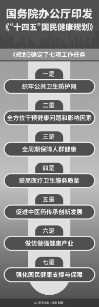 國務院辦公廳日前印發(fā)《‘十四五’國民健康規(guī)劃》(以下簡稱《規(guī)劃》)?!兑?guī)劃》提出,到2025年,公共衛(wèi)生服務能力顯著增強,一批重大疾病危害得到控制和消除,醫(yī)療衛(wèi)生服務質量持續(xù)改善,醫(yī)療衛(wèi)生相關支撐能力和健康產業(yè)發(fā)展水平不斷提升,國民健康政策體系進一步健全,人均預期壽命在2020年基礎上繼續(xù)提高1歲左右。 《規(guī)劃》指出,“十四五”時期衛(wèi)生健康工作堅持以習近平新時代中國特色社會主義思想為指導,把人民群眾生命安全和身體健康放在第一位,全面推進健康中國建設,加快實施健康中國行動,深化醫(yī)藥衛(wèi)生體制改革,持續(xù)推動發(fā)展方式從以治病為中心轉變?yōu)橐匀嗣窠】禐橹行?,為群眾提供全方位全周期健康服務?/p> 《規(guī)劃》確定了七項工作任務。一是織牢公共衛(wèi)生防護網。提高疾病預防控制能力,完善監(jiān)測預警機制,健全應急響應和處置機制,提高重大疫情救治能力。二是全方位干預健康問題和影響因素。普及健康生活方式,加強傳染病、寄生蟲病和地方病防控,強化慢性病綜合防控和傷害預防干預,完善心理健康和精神衛(wèi)生服務,維護環(huán)境健康與食品藥品安全,深入開展愛國衛(wèi)生運動。三是全周期保障人群健康。完善生育和嬰幼兒照護服務,保護婦女和兒童健康,促進老年人健康,加強職業(yè)健康保護,保障脫貧地區(qū)和殘疾人等相關重點人群健康服務。四是提高醫(yī)療衛(wèi)生服務質量。優(yōu)化醫(yī)療服務模式,加強醫(yī)療質量管理,加快補齊服務短板。五是促進中醫(yī)藥傳承創(chuàng)新發(fā)展。充分發(fā)揮中醫(yī)藥在健康服務中的作用,夯實中醫(yī)藥高質量發(fā)展基礎。六是做優(yōu)做強健康產業(yè)。推動醫(yī)藥工業(yè)創(chuàng)新發(fā)展,促進高端醫(yī)療裝備和健康用品制造生產,促進社會辦醫(yī)持續(xù)規(guī)范發(fā)展,增加商業(yè)健康保險供給,推進健康相關業(yè)態(tài)融合發(fā)展。七是強化國民健康支撐與保障。深化醫(yī)藥衛(wèi)生體制改革,強化衛(wèi)生健康人才隊伍建設,加快衛(wèi)生健康科技創(chuàng)新,促進全民健康信息聯(lián)通應用,完善衛(wèi)生健康法治體系,加強交流合作。 《規(guī)劃》提出,加強組織領導,動員各方參與,做好宣傳引導,強化監(jiān)測評價,推動各項任務落實。 (據新華社) |