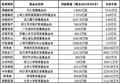 中科創(chuàng)達(dá)3月13日晚披露,公司控股股東趙鴻飛擬向北京理工大學(xué)教育基金會(huì)(以下簡稱“北理工教育基金會(huì)”)捐贈(zèng)其間接持有的公司16.9萬股股份。以中科創(chuàng)達(dá)當(dāng)前股價(jià)估算,上述捐贈(zèng)的股份市值約1041.38萬元。如此大手筆的捐贈(zèng)也引發(fā)了市場熱議。 作為在民政部正式登記注冊(cè)的慈善組織,北理工教育基金會(huì)承諾其受贈(zèng)資金都將用于北京理工大學(xué)的教育發(fā)展及社會(huì)公益事業(yè)。 記者根據(jù)A股上市公司過往定期報(bào)告梳理發(fā)現(xiàn),目前有十幾家基金會(huì)活躍其中。截至目前,這些基金會(huì)合計(jì)持股市值已超百億元,其持股主要來自于上市公司股東捐贈(zèng)。 截至2023年9月30日,河仁慈善基金會(huì)持有福耀玻璃股票1.7億股;截至今年3月13日收盤,上述股份市值高達(dá)74.41億元。 河仁基金會(huì)由企業(yè)家、福耀玻璃董事長曹德旺捐資創(chuàng)立,是全國第一也是唯一經(jīng)由國務(wù)院審批、以金融資產(chǎn)(股票)創(chuàng)辦的全國性非公募基金會(huì)?;饡?huì)的名稱,來自曹德旺的父親曹河仁,名稱中蘊(yùn)藏“上善若水,厚德載物”之意。 2011年5月,在河仁基金會(huì)成立大會(huì)上,曹德旺與其妻子陳鳳英宣布向基金會(huì)捐贈(zèng)個(gè)人所持福耀玻璃3億股股票。上述股票過戶當(dāng)日市值為35.49億元。 2012年度,河仁基金會(huì)減持福耀玻璃股票1000萬股,期末持股2.9億股。在此后的多年時(shí)間里,河仁基金會(huì)所持福耀玻璃股票一直未發(fā)生變化。2020年度,河仁基金會(huì)減持福耀玻璃股票6891.09萬股,期末持股2.21億股。2021年、2022年河仁基金會(huì)分別減持3180.02萬股、1977.6萬股,持股降至1.7億股。 曹德旺一直熱衷慈善。據(jù)公開信息,從1983年第一次捐款至今,曹德旺累計(jì)個(gè)人捐款達(dá)160億元。 持股市值排名第二的慈善基金會(huì)為上海工商界愛國建設(shè)特種基金會(huì)(以下簡稱“愛建基金會(huì)”)。愛建基金會(huì)持有愛建集團(tuán)股票1.77億股,市值約8.06億元。 據(jù)愛建基金會(huì)網(wǎng)站介紹,其前身是上海工商界愛國建設(shè)特種基金(以下簡稱“愛建特種基金會(huì)”)。上世紀(jì)80年代末至90年代初,愛建集團(tuán)前身愛國建設(shè)醞釀股份制改革,把歷年積累的4500萬元捐贈(zèng)出來,設(shè)立了愛國建設(shè)特種基金。1992年9月,愛國建設(shè)改制為股份公司,愛建特種基金會(huì)成為發(fā)起人股東。2005年4月,愛建特種基金會(huì)更名為愛建基金會(huì)。 愛建集團(tuán)上市后,愛建基金會(huì)長期為公司控股股東。2012年6月,愛建集團(tuán)完成非公開發(fā)行,愛建基金會(huì)持股比例遭稀釋。上市公司在2012年年報(bào)中稱自己無控股股東。 2018年6月,愛建集團(tuán)非公開發(fā)行股票完成及董事會(huì)調(diào)整后,均瑤集團(tuán)成為上市公司控股股東。愛建基金會(huì)退居次席,為公司第二大股東。 持股市值排名第三的為浙江嘉行慈善基金會(huì)(以下簡稱“嘉行基金會(huì)”)。截至去年9月末,嘉行基金會(huì)持有海亮股份股票6107.35萬股。這筆股權(quán)目前市值約5.65億元。 嘉行基金會(huì)成立于2007年8月。其網(wǎng)站稱,基金規(guī)模為11.86億元,全部來源于海亮集團(tuán)(海亮股份控股股東)及創(chuàng)始人馮海良和公司其他股東捐贈(zèng)。截至2023年年底,嘉行基金會(huì)累計(jì)捐贈(zèng)總額超過21.47億元。 截至去年9月末,浙江存濟(jì)醫(yī)療教育基金會(huì)(以下簡稱“存濟(jì)基金會(huì)”)持有通策醫(yī)療股票796.08萬股。這筆股權(quán)目前市值5.25億元。 據(jù)相關(guān)報(bào)道,2015年7月,通策醫(yī)療牽頭發(fā)起成立存濟(jì)基金會(huì)。公司實(shí)際控制人呂建明曾表示,其希望基金會(huì)在未來能夠?yàn)橹袊F(xiàn)代醫(yī)學(xué)的長期發(fā)展奠定系統(tǒng)的、堅(jiān)實(shí)的、高水平的基礎(chǔ),推動(dòng)醫(yī)學(xué)基礎(chǔ)研究,引進(jìn)世界先進(jìn)醫(yī)療技術(shù),提高醫(yī)療教育水平等。 2019年12月,通策醫(yī)療披露,其股東鮑正梁向存濟(jì)基金會(huì)捐贈(zèng)961.92萬股公司股票,用于符合基金會(huì)資助標(biāo)準(zhǔn)的醫(yī)療教育項(xiàng)目。 自2022年第四季度起,存濟(jì)基金會(huì)陸續(xù)減持了所持通策醫(yī)療部分股票。至2023年6月末,存濟(jì)基金會(huì)持股降至796.08萬股。 美的集團(tuán)創(chuàng)始人何享健發(fā)起設(shè)立的廣東省和的慈善基金會(huì)(以下簡稱“和的基金會(huì)”)持有賽意信息股票2000萬股。截至目前,和的基金會(huì)上述持股市值約4.05億元,排名第五。截至2022年12月,和的基金會(huì)對(duì)外資助金額近22億元,主要用于資助醫(yī)養(yǎng)健康、文化藝術(shù)、社區(qū)發(fā)展等項(xiàng)目。 一些基金會(huì)獲贈(zèng)的大額股份尚未完成過戶。 概倫電子2023年7月曾披露,為支持母校華南理工大學(xué)的教育事業(yè)的發(fā)展,促進(jìn)學(xué)校集成電路學(xué)科的建設(shè)與發(fā)展,公司董事長劉志宏將向廣東省華南理工大學(xué)教育發(fā)展基金會(huì)捐贈(zèng)其間接持有的178萬股公司股份。按照概倫電子當(dāng)時(shí)的市值計(jì)算,其捐贈(zèng)總價(jià)值超過4700萬元。這筆股權(quán)需在2