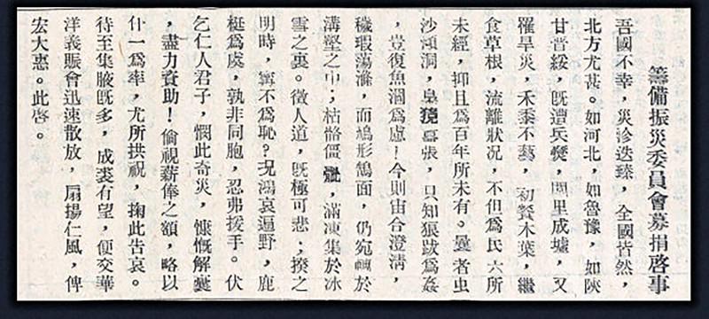 大學(xué)作為培育文明、教書育人的平臺,是傳播與踐行慈善文化的重要基地。仔細(xì)追溯清華大學(xué)的歷史就會發(fā)現(xiàn),清華人早在建校初期就逐步形成公益慈善傳統(tǒng),并與清華精神的培育與完善相輔相成。有明確資料證明,在1937年之前的早期清華歷史上曾進(jìn)行過多次公益募捐活動,研討這些清華慈善實踐的史實,感悟蘊(yùn)含其中的思想精華,對于清華大學(xué)的發(fā)展,仍然具有十分重要的現(xiàn)實意義。 早期清華所處的社會環(huán)境極其復(fù)雜,可以說,是在近代中國社會矛盾重重,外憂內(nèi)患頻頻的艱難時代中 “搞教育,做學(xué)問”,蹣跚前行,步步驚心。在不斷發(fā)生的天災(zāi)人禍面前,清華人一方面以堅持大學(xué)教育的發(fā)展為己任,一方面也以各種形式為“賑災(zāi)扶貧,抗敵勞軍”竭盡“匹夫報國”的盡心之力。這些慈善行動為百年清華的歷史留下了深刻的印記和寶貴的精神財富。 1928年組織旱災(zāi)捐助 根據(jù)史料記載,從1928年開始,中國北方發(fā)生過一場持續(xù)三年的罕見大災(zāi)荒。這場以旱為主,蝗、風(fēng)雪、雹、水、疫并發(fā)的巨災(zāi),以陜西、甘肅為中心,遍及山西、綏遠(yuǎn)、河北、察哈爾、熱河、河南等八省,并波及山東、蘇北、皖北、湖北、湖南、四川、廣西的一部或大部,形成了一個面積廣袤的災(zāi)區(qū)。這場災(zāi)荒史稱“民國十八年年饉”,并被歷史學(xué)家列為“中國近代十大災(zāi)荒”之一。 在災(zāi)情被媒體持續(xù)曝光之后,清華師生也被這場災(zāi)難的嚴(yán)重程度所震驚,并迅速采取募捐賑災(zāi)行動。1928年12月20日,剛剛正式成立不久的國立清華大學(xué)設(shè)立“籌備賑災(zāi)委員會”,委員會由清華秘書長馮芝生、教務(wù)長楊金甫、外文系主任王立山教授、庶務(wù)科主任張仲魯、體育館主任馬約翰、學(xué)生評議部主席高琦、干事部主席張企泰以及學(xué)生代表李健吾、蘇宗固、容啟東、朱麗琛共11人組成,馮芝生任主席。時任校長羅家倫(1897—1969)參加了賑災(zāi)委員會第一次會議。會議對有關(guān)賑災(zāi)事宜進(jìn)行決議,希望教職員捐出每月薪金的十分之一。羅家倫校長和王立山主任當(dāng)場允諾捐出月薪金的十分之二,以為表率。 賑災(zāi)委員會于12月26日在《國立清華大學(xué)??返谝淮蔚禽d了募捐啟事,其中寫道:“吾國不幸,災(zāi)診迭臻,全國皆然,北方尤甚?!醪湍救~,繼食草根,流離狀況,不但為民六所未經(jīng),抑且為百年所未有……征人道,既極可悲;揆之明時,寧不為恥?況哀鴻遍野,鹿梃為虞,孰非同胞,忍弗援手。伏乞仁人君子,憫此奇災(zāi),慷慨解囊,盡力資助!倘視薪俸之額,略以什一為率,尤所拱祝。掬此告哀。待至集腋既多,成裘有望,便交華洋義賑會迅速散放,扇揚(yáng)仁風(fēng),俾宏大惠?!鼻檎嬉馇?,躍然紙上! 在發(fā)出賑災(zāi)募捐啟事之后,賑災(zāi)委員會又于12月28日、31日連續(xù)在??系禽d有關(guān)災(zāi)情的報道和募捐辦法,同時在12月29日晚間在大禮堂組織了一場“賑災(zāi)游藝大會”,清華銅管樂隊參演,并請來一些當(dāng)時著名的昆曲名家、魔術(shù)師、演奏家獻(xiàn)藝。所得門票價款悉數(shù)轉(zhuǎn)為賑災(zāi)款。這種募捐形式也可以看作是發(fā)展至今的各類“賑災(zāi)義演”的雛形。 在這次巨大災(zāi)情中,中國華洋義賑會、中國紅十字會、世界紅卍字會、中國濟(jì)生會等社會救助團(tuán)體在賑災(zāi)工作中扮演著重要角色,發(fā)揮了舉足輕重的作用。這些社會救助團(tuán)體主要通過募集與發(fā)放賑款、衣物,開辦粥廠,開設(shè)災(zāi)民收容所,發(fā)放貸款、種子等措施開展救濟(jì)工作。當(dāng)年清華的賑災(zāi)善款主要是通過華洋義賑會轉(zhuǎn)賑。經(jīng)過三個月的募捐,清華全校師生員工募集的善款超過2000元。 1929年4月1日,??禽d中國華洋義賑救災(zāi)總會來函,告知收到清華全校師生員工募集的2225.58元善款,并已“歸入急賑??铐椣沦徏Z匯放”。在大規(guī)模募捐之后,在??先钥梢园l(fā)現(xiàn)有師生陸續(xù)捐款的報道,如外國語文系教授翟孟生一次捐款30大洋,舊大一學(xué)生捐款22元等。 1931年組織水災(zāi)捐助 在中國近代史上,1931年發(fā)生過一次迄今為止最嚴(yán)重的水災(zāi)。據(jù)史料稱,這一年中國氣候反常,大面積降雨。從5月下旬開始,長江、黃河、淮河、松花江、遼河、鴨綠江流域都持續(xù)降雨,時間竟長達(dá)三個月之久。水災(zāi)區(qū)域南到珠江流域,北至長城關(guān)外,東起江蘇北部,西至四川盆地,范圍之廣前所未有,造成的災(zāi)民數(shù)量起碼達(dá)到1億人,死亡人數(shù)約400萬,經(jīng)濟(jì)損失不計其數(shù)。饑餓、寒冷、傳染病的肆意侵襲,更多的人死于洪災(zāi)之后的饑荒與疾病,可謂“生靈涂炭、滿目瘡痍”。由此,這次災(zāi)害被列為世界十大最嚴(yán)重的自然災(zāi)害之一。 面對這場讓處于多事之秋的中華民族幾近于“九死之絕境”的天災(zāi),清華人再次表現(xiàn)出“仁者之心”,慷慨解囊。清華全體在冊教職員按照國民政府教育部統(tǒng)一部署,從九月、十月、十一月這三個月的薪金中按比例扣除水災(zāi)賑捐款。其中九月為2981元,十月為3021元,十一月為 2886.75元,三個月合計捐款為8888.75元。 1931年為東北抗戰(zhàn)捐