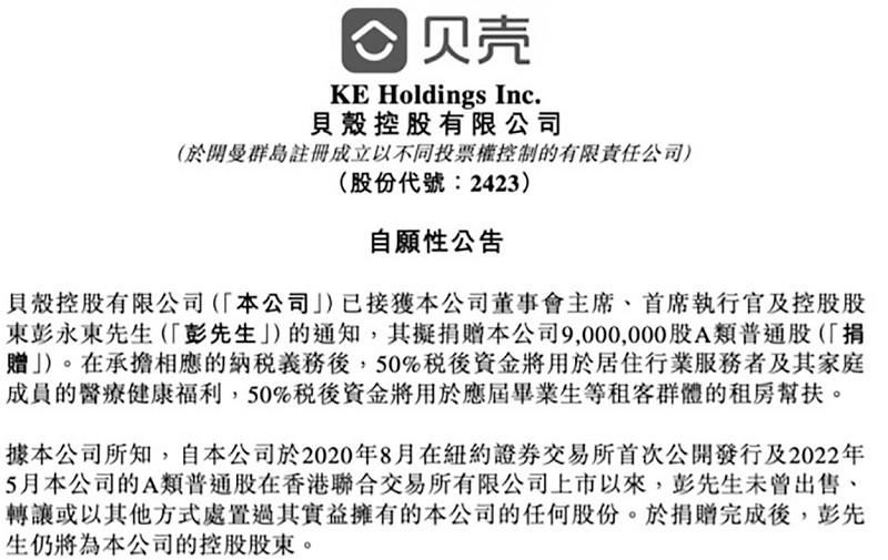 ■ 本報記者 皮磊 4月17日,貝殼發(fā)布自愿性公告稱,已接獲貝殼董事會主席、首席執(zhí)行官及控股股東彭永東的通知,其擬捐贈900萬股A類貝殼普通股。按照17日下午收盤價51.95港元計算,此次捐贈市值約為4.68億港元(約合人民幣4.4億元)。 根據(jù)公告,此次捐贈在承擔(dān)相應(yīng)的納稅義務(wù)后,50%的稅后資金將用于居住行業(yè)服務(wù)者及其家庭成員的醫(yī)療健康福利,50%的稅后資金將用于應(yīng)屆畢業(yè)生等租客群體的租房幫扶。據(jù)悉,貝殼為此將設(shè)立專門機構(gòu),進(jìn)行長期運營。 據(jù)貝殼方面介紹,當(dāng)前貝殼平臺聚集了幾十萬名居住行業(yè)服務(wù)者,包括房產(chǎn)交易經(jīng)紀(jì)人、家裝安裝工、租賃管家等。通過兜住居住行業(yè)服務(wù)者及其家庭成員的醫(yī)療健康風(fēng)險,讓這些服務(wù)者更有尊嚴(yán)地提供服務(wù),更安心地工作,將有益于服務(wù)者長期執(zhí)業(yè)以及為消費者提供更優(yōu)質(zhì)的服務(wù)。此外,該筆捐贈也將幫助應(yīng)屆畢業(yè)生等群體“租得起”“住得好”,緩解他們的住房問題。 公開資料顯示,貝殼集團(tuán)起源于2001年成立的鏈家房地產(chǎn)經(jīng)紀(jì)公司,2009年上線“鏈家在線”,2018年貝殼正式上線。2020年,貝殼在紐交所上市,成為中國居住服務(wù)平臺第一股。2022年,貝殼在港交所上市。2023年,其推出“一體三翼”戰(zhàn)略升級,其中“一體”指新房、二手房交易,“三翼”指整裝、租賃和貝好家業(yè)務(wù)。 依托平臺優(yōu)勢,近年來貝殼持續(xù)聚焦社區(qū)公益。 自2014年起,鏈家在全國各城市推出“高考休息站”,利用門店的休息空間、便民服務(wù)等資源為考生及家長提供便利。此后,隨著更多經(jīng)紀(jì)品牌和門店加入,“高考休息站”升級為“高考服務(wù)站”,成為貝殼重點公益項目之一。 此外,自2018年發(fā)起“我來教您用手機”項目以來,貝殼長期關(guān)注社區(qū)場景中“一老一小”的需求。日前,貝殼公益先后啟動“穩(wěn)當(dāng)當(dāng)計劃”和“銀發(fā)守護(hù)計劃”兩個新的助老公益項目。其中,前者主要聚焦老舊小區(qū)的老年人出行安全,為未安裝電梯的老舊小區(qū)加裝樓道內(nèi)所有樓層的靠墻扶手和樓梯首尾臺階警示標(biāo)識?!般y發(fā)守護(hù)計劃”則聚焦獨居老人的居家安全問題。項目整合貝殼惠居的平臺技術(shù)優(yōu)勢,為60歲及以上獨居老人免費提供“智能硬件+平臺服務(wù)+意外保險”守護(hù)方案,以及跌倒報警器和語音報警器等智能設(shè)備,同時搭建高效響應(yīng)平臺,確保老人需求及時響應(yīng)。 自2021年起,貝殼面向全平臺各品牌、店東、經(jīng)紀(jì)人和員工發(fā)起“善貝GO”公益行動,鼓勵志愿者通過捐獻(xiàn)步數(shù)兌換愛心資金,捐助公益項目。在助力鄉(xiāng)村振興方面,貝殼“經(jīng)紀(jì)人助農(nóng)計劃”借助平臺力量,將經(jīng)紀(jì)人家鄉(xiāng)的農(nóng)產(chǎn)品銷往全國,并通過點對點專項指導(dǎo)、一對一直線幫扶模式,提供產(chǎn)品包裝上架、圖片展示、銷售服務(wù)等全流程指導(dǎo),助推鄉(xiāng)村產(chǎn)業(yè)振興?!爸凵鐓^(qū),在‘小美好’中創(chuàng)造‘大能量’?!迸碛罇|曾對媒體表示,貝殼發(fā)揮全國范圍內(nèi)的門店及服務(wù)者優(yōu)勢,深入眾多社區(qū),成為公益“毛細(xì)血管”,在創(chuàng)造社會價值的同時,為品牌價值觀的展現(xiàn)、口碑的建立、公益IP的培養(yǎng)形成助力。 |
