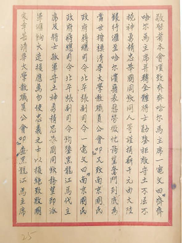 1931年,日本悍然發(fā)動九一八事變,中國人民不屈不撓的局部抗戰(zhàn),揭開了世界反法西斯戰(zhàn)爭的序幕。作為中國武裝抗日的“第一槍”,江橋抗戰(zhàn)宛如一聲驚雷,在白山黑水間激民族之義憤,燃滿腔之熱血。北平各界同仇敵愾,通過聲援、募捐等方式,表達(dá)對抗日志士的支持和守土衛(wèi)國的決心。 臨危受命江橋迎戰(zhàn)關(guān)東軍 初夏的清華園,萬物蔥蘢、水木禽鳴,荷塘漣漪一圈圈蕩開。禮堂前,“行勝于言”的石刻在陽光下熠熠生輝。 正值周末,入校游學(xué)的青少年絡(luò)繹不絕,在標(biāo)志美景前競相留影。風(fēng)華正茂的學(xué)子騎著車經(jīng)過,衣角飄動,聚焦了人們欽羨的目光。 近百年前,以清華為代表的北平高校師生,同樣以實際行動,成為全民抗戰(zhàn)意識的引領(lǐng)者,正是“行勝于言”的無聲寫照。 1931年,九一八事變爆發(fā)后,日本侵略軍一周內(nèi)相繼侵占遼、吉兩省主要城市,并圖謀進(jìn)犯黑龍江省。黑河警備司令兼步兵第3旅旅長馬占山臨危受命,主持黑龍江軍政。 “馬占山在嫩江北岸至昂昂溪之間,構(gòu)筑了三道防線。11月3日,日軍兩列鐵甲車開赴嫩江橋,日軍飛機向中國軍隊投擲炸彈?!北本┦袡n案館展陳處副處長劉靜的講述,令人感受到當(dāng)時戰(zhàn)況之激烈?!皷|北氣溫已低至嚴(yán)寒,馬占山率領(lǐng)愛國官兵,以落后的武器、簡陋的裝備,迎戰(zhàn)擁有飛機、大炮、坦克的日本關(guān)東軍,喊殺聲、刺刀撞擊聲震蕩山野……半個月的時間,抵擋了日軍一波接一波的攻擊。” “男兒抗日死沙場,青史垂名姓字香?!苯瓨蚩箲?zhàn)的消息傳到北平后,愛國學(xué)子熱血沸騰,紛紛請纓要求北上抗日。與此同時,北平各界慷慨解囊,為抗日將士募集善款。其中清華大學(xué)發(fā)揮了先鋒作用,該校教職員公會對日委員會捐薪千元,緊接著,由學(xué)生自治會迅速組織全校募捐活動。 慷慨解囊為將士募集善款 不僅自發(fā)籌措善款,清華大學(xué)教職員公會對日委員會還發(fā)函致北平大學(xué)工學(xué)院,邀對方對馬占山進(jìn)行一致聲援。 很快,北平大學(xué)工學(xué)院也發(fā)出募捐慰勞馬占山及諸將士的啟事。劉靜展開這份1931年11月27日的史料,其上載明“當(dāng)此雪地冰天,前方愛國將士斷頭折臂,努力為國家爭存亡之際,吾輩身在后方,未能先期赴國難,自當(dāng)各盡職責(zé),以表救國之意……”字里行間,盡顯高校青年的報國情懷。 學(xué)界之外,各界群眾也自發(fā)組織慰問團、后援會,捐款捐物,全力支持。劉靜介紹,例如東北民眾救國會,爭取張學(xué)良以及國內(nèi)各界人士、海外僑胞的資助,開展募捐和“義賣”,發(fā)行“愛國獎券”等,給黑龍江軍民以極大的支持。 一封封書信、電報,記錄下這段波瀾壯闊的歷史。1932年1月4日的《國立清華大學(xué)??飞?,登載馬占山將軍給清華大學(xué)的復(fù)電,稱:“承惠巨款,益勵初衷。謹(jǐn)率部曲遙致謝忱?!倍盏狡浇?qū)W術(shù)團體對日聯(lián)合會發(fā)來的電報后,馬占山更回復(fù),“占山忝屬軍人,尤其責(zé)無旁貸,茍一息之尚存,豈慮孤軍之苦戰(zhàn)?!辩H鏘有力的表達(dá),書就這位民族英雄的氣節(jié)風(fēng)骨,也掀開軍民同仇敵愾,保家衛(wèi)國的篇章。 奔走宣傳直面“最殘酷時代” 江橋抗戰(zhàn)的壯舉震動海內(nèi)外,除捐款捐物,北平各界還廣泛發(fā)起宣傳活動。其中北平師范大學(xué)(現(xiàn)北京師范大學(xué)前身)師生表現(xiàn)活躍,組織了國立北平師范大學(xué)教職員對日外交后援會(后改稱平津?qū)W術(shù)團體對日聯(lián)合會師大分會)、北平師范大學(xué)抗日救國會等團體,分析抗戰(zhàn)形勢,揭露日本暴行。 如今的北京師范大學(xué),地處車水馬龍的北三環(huán)旁,徜徉校園,傍晚的風(fēng)攜來芬芳花香,耳畔蕩起廣播悠揚的樂曲。正是拍攝畢業(yè)照的時節(jié),意氣風(fēng)發(fā)的年輕人三三兩兩,在古色古香的教學(xué)樓、京師學(xué)堂、校訓(xùn)石碑前,定格下青春的光影。 當(dāng)年,也是這樣年紀(jì)相仿的學(xué)子們,心懷大義,為民族存亡奔走呼號。據(jù)北師大校史研究室提供的資料,1931年10月26日,該校學(xué)生抗日救國會宣傳隊,曾赴長辛店機車廠演講抗日救國,并散發(fā)《為日本帝國主義占領(lǐng)東三省告工友書》。 此外,北平師范大學(xué)抗日救國會還創(chuàng)辦了《抗日周刊》,北京市檔案館所藏第二期,出版于1931年11月2日。末尾征稿啟事疾呼:人類最殘酷的時代已經(jīng)降臨到我們面前了!這種“殘酷”“無理性”“暴戾”,逼迫著我們不得不負(fù)起這種重大的使命去奮斗,去拼命,去推倒一切的人壓迫人的禽獸行為!并號召同學(xué)們努力投稿,“戰(zhàn)勝一切的障礙,充實抗日的內(nèi)容?!?br> 劉靜介紹,北平各界的全力支持,給了馬占山將軍抗戰(zhàn)到底的動力?!敖瓨蚩箲?zhàn)更喚起中華民族的空前覺醒,作為中國人民抗日斗爭的序曲,永載史冊。” (據(jù)《北京晚報》) |