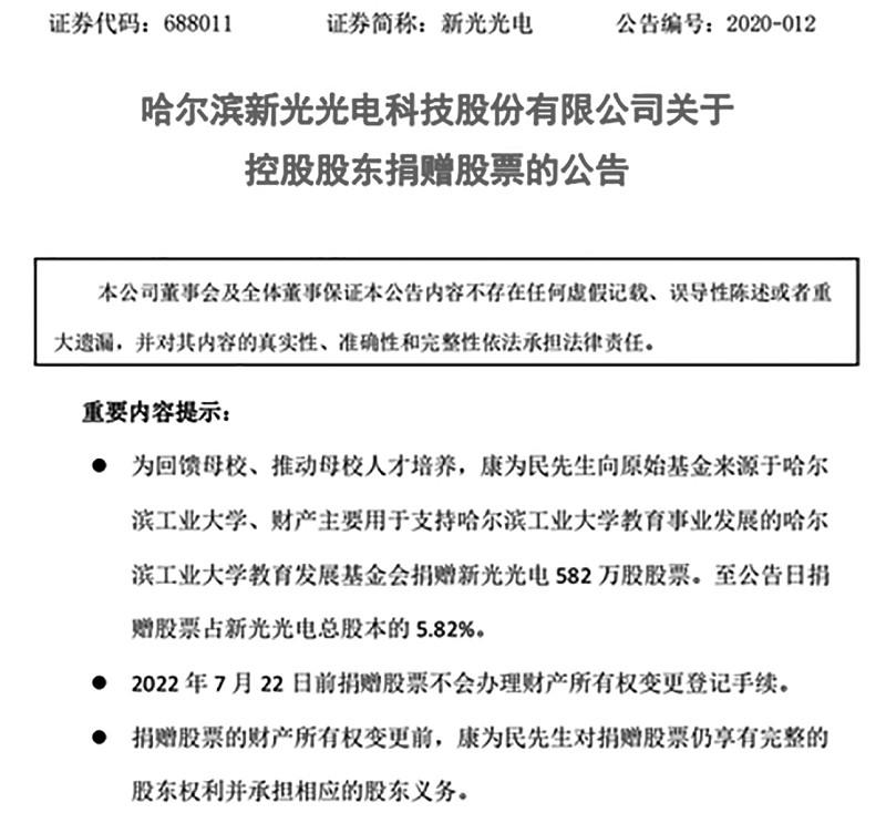 近年來股權(quán)捐贈已成為企業(yè)家/企業(yè)支持慈善事業(yè)的共同選擇和未來趨勢。而由于經(jīng)濟波動等不確定性影響因素增多,有關(guān)捐贈承諾兌現(xiàn)和落地執(zhí)行情況也備受社會關(guān)注,由此引發(fā)的爭議一直未斷。 ■ 本報記者 皮磊 據(jù)多家媒體報道,哈爾濱新光光電科技股份有限公司(簡稱“新光光電”)日前發(fā)布公告稱,公司近日收到嵩縣監(jiān)察委員會簽發(fā)的關(guān)于對公司控股股東、實際控制人、董事長、總經(jīng)理康為民的《立案通知書》和《留置通知書》,康為民被實施留置措施。 針對上述情況,有媒體致電新光光電證券部嘗試了解更多細節(jié)。該公司工作人員回應稱,“目前尚未獲得更多確切消息?!惫ぷ魅藛T表示,公司內(nèi)控完善,已召開臨時董事會落實工作安排,主營業(yè)務(wù)與產(chǎn)品方向未變。 作為一家軍工電子信息企業(yè),該消息一經(jīng)發(fā)布即引發(fā)外界猜測。不過,在關(guān)注事件進展的同時,有關(guān)康為民曾向其母校哈爾濱工業(yè)大學捐贈582萬股股票一事被翻出,甚至對該筆捐贈的程序和動機提出質(zhì)疑。事實上,近年來股權(quán)捐贈已成為企業(yè)家/企業(yè)支持慈善事業(yè)的共同選擇和未來趨勢。而由于經(jīng)濟波動等不確定性影響因素增多,有關(guān)捐贈承諾兌現(xiàn)和落地執(zhí)行情況也備受社會關(guān)注,由此引發(fā)的爭議一直未斷。 582萬股股權(quán)捐贈始末 據(jù)新光光電官網(wǎng)介紹,新光光電成立于2007年11月,注冊資本1億元,是東北地區(qū)科創(chuàng)板上市公司。該公司是一家將像方掃描成像制導技術(shù)、多光學波段合成技術(shù)等先進光電技術(shù)應用于光學制導類武器研制的企業(yè),致力于服務(wù)國防科技工業(yè)先進武器系統(tǒng)研制等領(lǐng)域。公開資料顯示,康為民父子都是哈工大人,康為民本科和碩士都在哈工大就讀,隨后又在哈工大工作20多年,直到創(chuàng)辦上市公司。 2020年6月2日,新光光電發(fā)布關(guān)于控股股東捐贈股票的公告。公告稱,公司于2020年6月1日接到控股股東康為民通知,其與哈爾濱工業(yè)大學教育發(fā)展基金會簽署了《捐贈協(xié)議書》。根據(jù)公告,為回饋母校、推動母校人才培養(yǎng),康為民向哈爾濱工業(yè)大學教育發(fā)展基金會捐贈新光光電582萬股股票。至公告日,捐贈股票占新光光電總股本的5.82%。按照當時股價計算,這批股票價值高達2.4億元。 按照捐贈協(xié)議,該筆捐贈用于設(shè)立“松高·卓越工程師獎助學金”、設(shè)立“松高·優(yōu)秀中青年教師貢獻獎”、設(shè)立“松高·優(yōu)秀科技成果獎”、設(shè)立“新興產(chǎn)業(yè)與技術(shù)發(fā)展創(chuàng)新基金”等。 2024年11月4日,新光光電發(fā)布關(guān)于控股股東捐贈股份完成過戶暨股東權(quán)益變動的提示性公告。公告稱,公司于2024年11月4日收到康為民通知,康為民與基金會的非交易過戶已經(jīng)在中國證券登記結(jié)算有限公司上海分公司完成過戶登記手續(xù),并出具了《證券過戶登記確認書》。 公告顯示,本次股份捐贈過戶登記完成后,康為民及其一致行動人持有公司股份52348457股,占公司總股本的52.35%,仍為公司控股股東。本次股份捐贈過戶登記完成后,哈爾濱工業(yè)大學教育發(fā)展基金會持有公司無限售流通股582萬股,占當時公司總股本的5.82%。 該公告還特別指出,本次股份捐贈未違反《上市公司收購管理辦法》《上市公司股東、董監(jiān)高減持股份的若干規(guī)定》《上海證券交易所上市公司股東及董事、監(jiān)事、高級管理人員減持股份實施細則》《上海證券交易所科創(chuàng)板上市公司自律監(jiān)管指南》等有關(guān)法律、法規(guī)、部門規(guī)章及規(guī)范性文件和《公司章程》的規(guī)定,也不存在相關(guān)股東因本次股份轉(zhuǎn)讓而違反尚在履行的承諾的情形。 記者查詢哈爾濱工業(yè)大學教育發(fā)展基金會2024年度工作報告發(fā)現(xiàn),2024年度基金會收到捐贈人康為民的非現(xiàn)金捐贈,合計金額為108950400元,捐贈用途為“助力學??蒲心芰ㄔO(shè)”。 股權(quán)捐贈已成趨勢 梳理近年來的大額捐贈案例發(fā)現(xiàn),股權(quán)捐贈已成為部分企業(yè)家/企業(yè)支持慈善事業(yè)的首要選項: 2025年 7月 10日晚,寧德時代發(fā)布關(guān)于股東無償捐贈部分公司股份的進展公告。公告稱,公司股東及副董事長李平及其配偶擬向上海復旦大學教育發(fā)展基金會捐贈其持有的公司405萬股股票,上述股票均為無限售流通股。7月10日,捐贈過戶手續(xù)已全部辦理完畢。按最新收盤價計算,該筆捐贈價值超11億元; 7月3日,北京龍軟科技股份有限公司發(fā)布控股股東無償捐贈部分公司股份的公告:控股股東毛善君向北京大學教育基金會無償捐贈其持有公司的250萬股無限售條件流通股,占公司總股本的3.43%。根據(jù)公告,此次捐贈資產(chǎn)用于全面支持北京大學地球與空間科學學院的發(fā)展建設(shè)。以龍軟科技當時股價(30.90元/股)估算,上述捐贈股份市值約為7725萬元; 2023年12月4日,迎駕貢酒發(fā)布公告稱,控股股東安徽迎駕集團股份有限公司擬向安徽六安市迎駕慈善基金會無償捐贈其持有的公司1950萬股無限售條件流通股,占公司總股本的2.44%。12月8日,迎駕貢