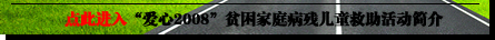 “愛心·希望”是“愛心2008”貧困家庭病殘兒童救助活動(dòng)的深化和延續(xù),其宗旨是秉承和繼續(xù)發(fā)揚(yáng)“愛心2008”的救助理念和精神,更多更好地幫助貧困家庭的病殘兒童!皭坌2008”貧困家庭病殘兒童救助活動(dòng)自2005年6月1日啟動(dòng)以來,重點(diǎn)在陜西、四川、江西、重慶、青海、內(nèi)蒙古、寧夏等省市自治區(qū)開展貧困家庭病殘兒童救助活動(dòng),截止目前累計(jì)救助4100多名病殘兒童。2005年6月1日至2008年5月31日間共救助3683名患兒,超額完成了“第一階段三年救助2008名患兒”的宏偉目標(biāo)!皭坌2008”活動(dòng)第一階段之所以取得圓滿成功得益于原國(guó)務(wù)院副總理姜春云、十一屆全國(guó)人大副委員長(zhǎng)周鐵農(nóng)、十屆全國(guó)人大副委員長(zhǎng)顧秀蓮、十屆全國(guó)人大副委員長(zhǎng)司馬懿艾買提、十屆全國(guó)人大副委員長(zhǎng)何魯麗、十一屆全國(guó)政協(xié)副主席阿不來提·阿布都熱西提、十一屆全國(guó)政協(xié)副主席張梅穎、十屆全國(guó)政協(xié)副主席郝建秀、九屆全國(guó)政協(xié)副主席孫孚凌、民政部部長(zhǎng)李學(xué)舉、民政部副部長(zhǎng)李立國(guó)、民政部副部長(zhǎng)姜力、民政部副部長(zhǎng)竇玉沛等國(guó)家和民政部領(lǐng)導(dǎo)關(guān)懷和支持;得益于民政部、中央綜治辦、全國(guó)總工會(huì)、共青團(tuán)中央、全國(guó)婦聯(lián)、中國(guó)紅十字總會(huì)、中華慈善總會(huì)、中國(guó)老齡協(xié)會(huì)等部門的大力支持;得益于中國(guó)福彩中心、中信銀行、中國(guó)石化、香港馬會(huì)等眾多愛心企業(yè)的慷慨解囊;得益于社會(huì)知名人士、文體界明星、愛心人士的無私奉獻(xiàn);得益于地方民政工作者、醫(yī)療機(jī)構(gòu)、志愿者的辛勤工作。