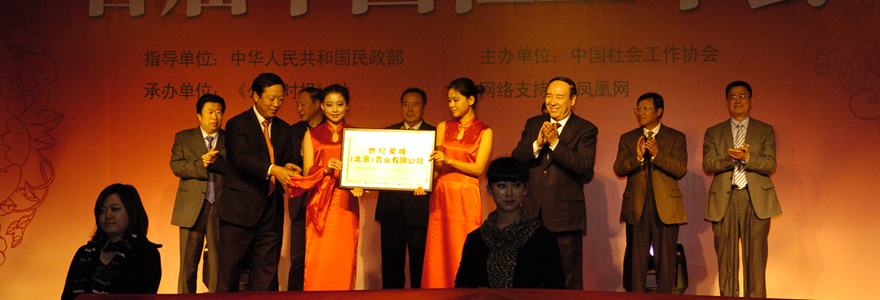 中國社會工作協(xié)會會長 徐瑞新(左三)、民政部社會福利和慈善事業(yè)促進(jìn)司司長 王振耀(右一)、世紀(jì)愛晚投資有限公司總裁 孫繼惠(左二)、