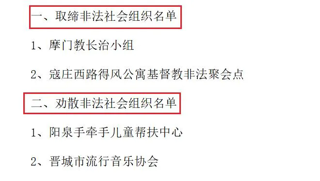 據(jù)山西省民政廳10月14日消息,山西省民政廳日前公布了一批依法取締和勸散的非法社會組織名單,其中取締兩家,包括摩門教長治小組、寇莊西路得風(fēng)公寓基督教非法聚會點;勸散兩家,包括陽泉手牽手兒童幫扶中心、晉城市流行音樂協(xié)會。